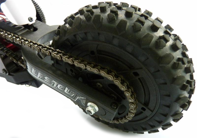 Модель мотоцикла Himoto Burstout MX400 хорошо сбалансирована и укреплена металлическими деталями. Алюминиевая рама, настоящий стальной цепь и закрытый влагозащищенный бокс для электроники обеспечивают надежность и ударопрочность. Запатентованная система гироскопов, мощные амортизаторы и сильная рулевая машинка обеспечивают абсолютную устойчивость на любой местности. Сердце мотоцикла - мощный электродвигатель 550-го класса, который питается от Li-Pol аккумулятора 7.4В и позволяет разгоняться до 40 км/ч.