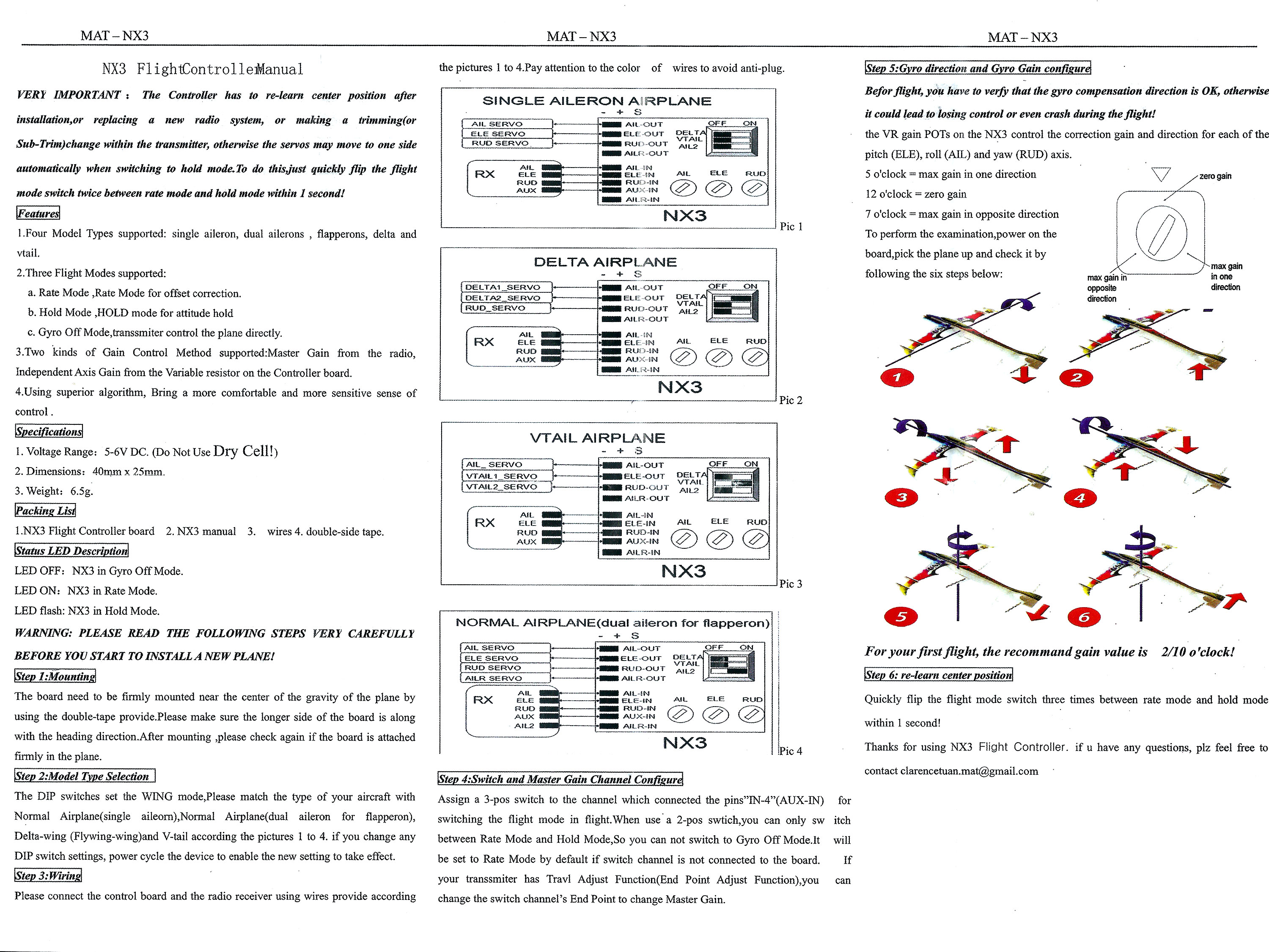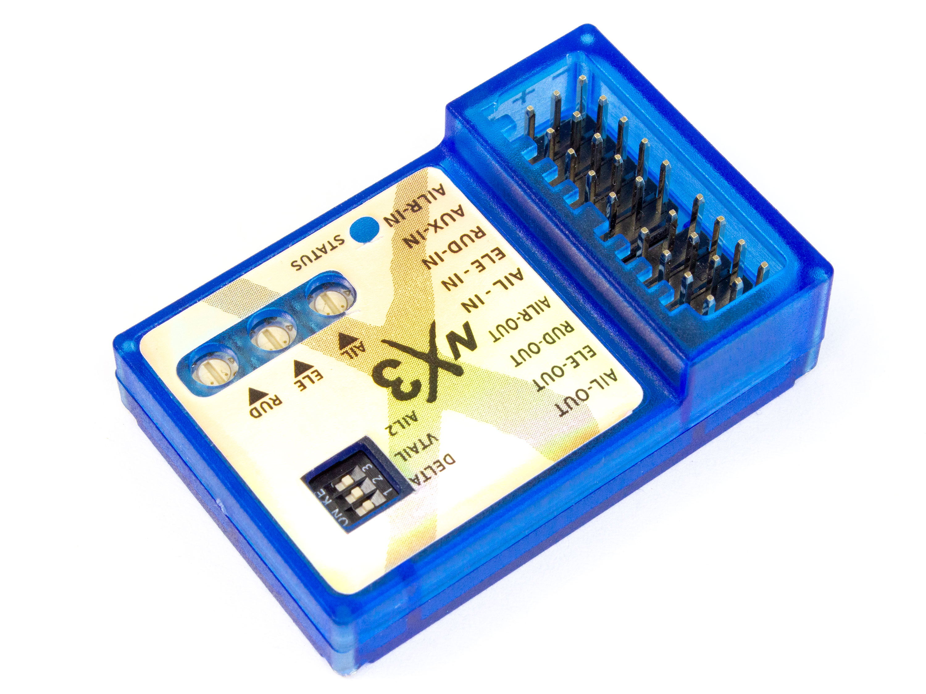 Дякую за Ваше звернення. Стабілізатор NX3 Pro потрібно розмістити на фюзеляжі максимально близько до центру ваги моделі та довшою стороною вздовж фюзеляжу. Наклейка на якій є написи повинна дивитися вниз, або вверх.
