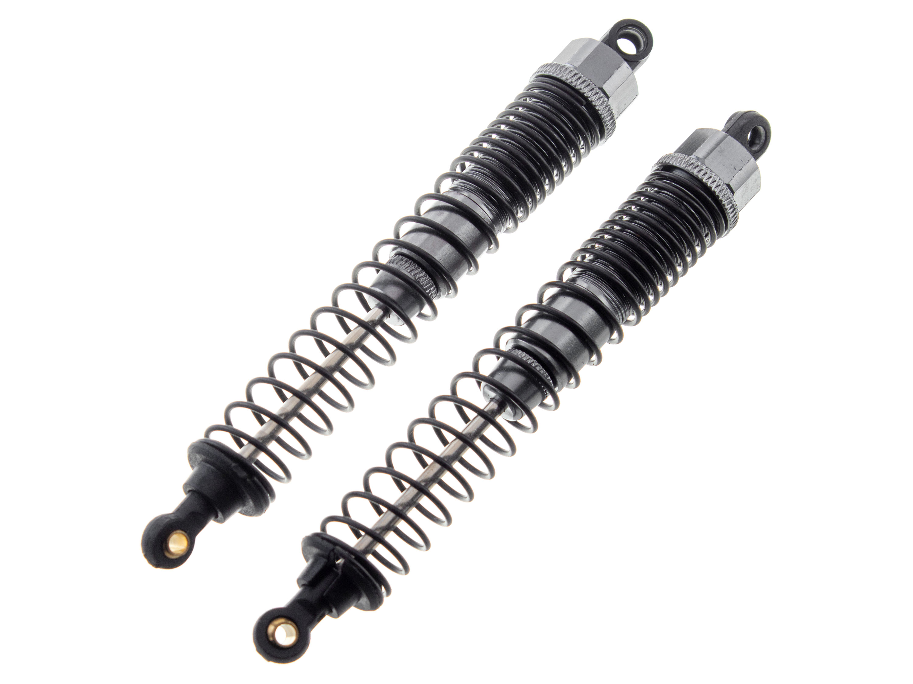 Алюминиевые амортизаторы для автомоделей 1/10 масштаба. Отверстия крепления рассчитаны под шаровой шарнир диаметром 5.8мм. Для пользования, амортизаторы нужно наполнить маслом. Технические характеристики: - Общая длина амортизатора: 128мм;