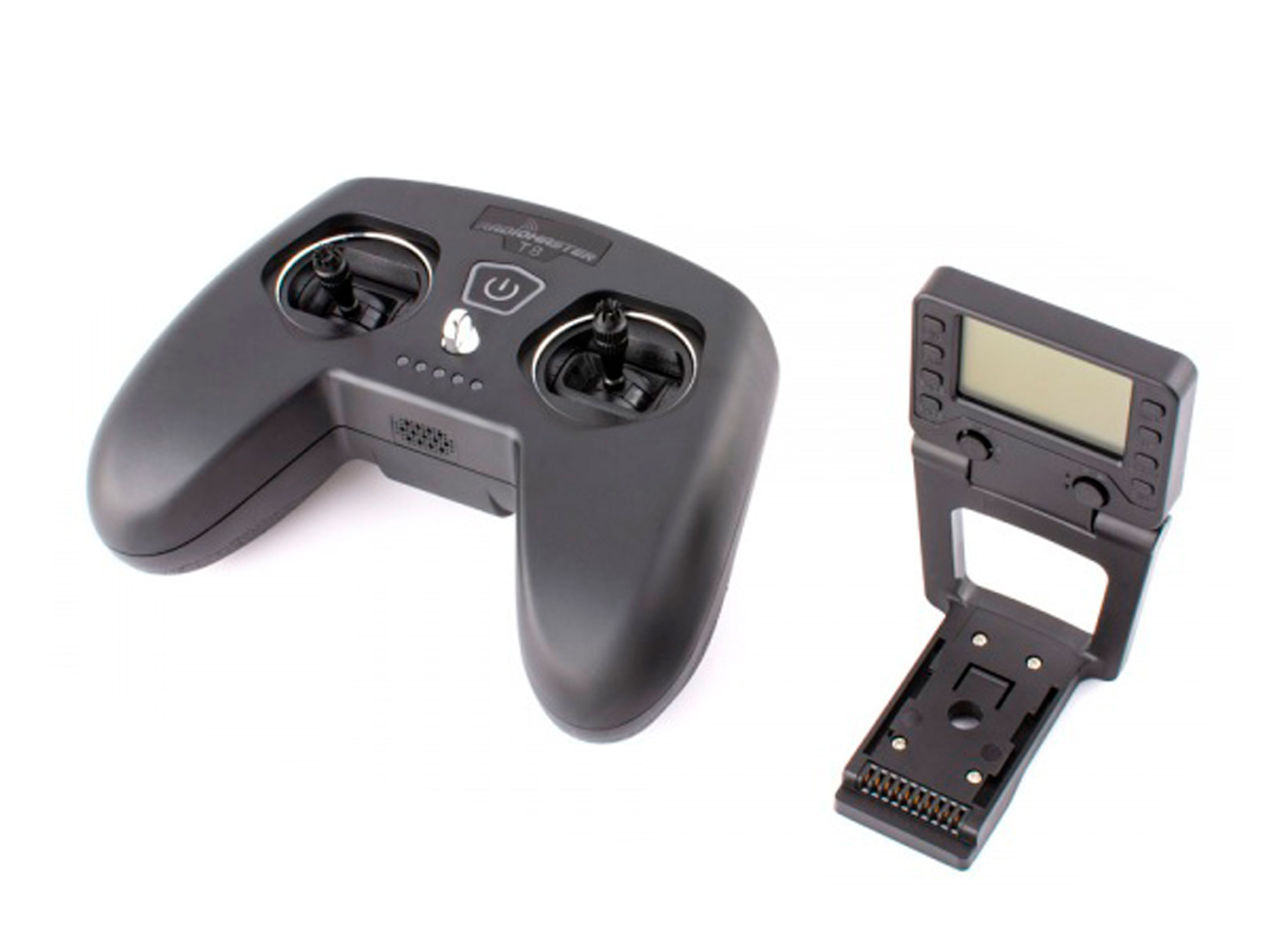 Интересное решение коснулось экрана передатчика. В T8 Pro - это монохромный складной дисплей с возможностью изменения угла наклона в пределах 180° и кнопками вокруг для навигации по меню.