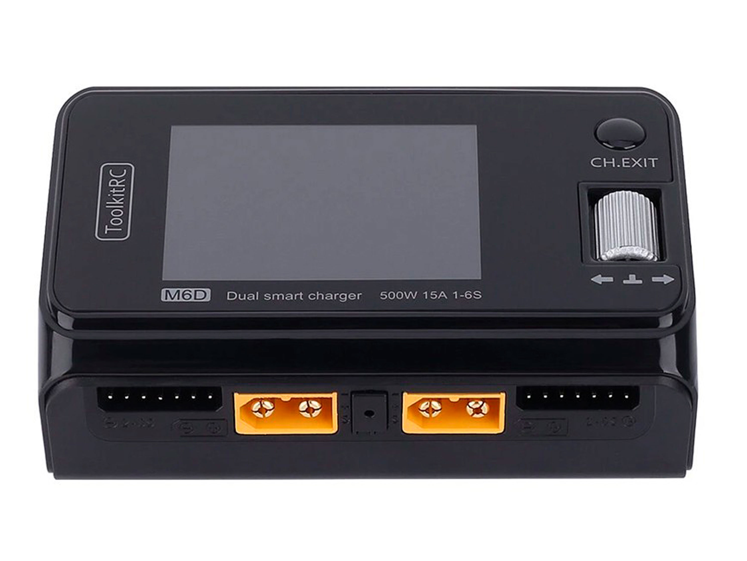 Универсальное, двухканальное зарядное устройство ToolkitRC M6D отличается асинхронным автоматическим распределением энергии на два канала по 250Вт/15A или синхронным выходом 500Вт/25A для большей мощности на один порт. Управление осуществляется с помощью удобного ролика и одной кнопки, а меню отображается на цветном и ярком дисплее. ToolkitRC M6D имеет большое количество переменных параметров, как для контроля аккумуляторов так и для самого зарядного: ограничение минимальной входного напряжения, ограничения входной мощности, установления безопасной температуры и безопасного времени заряда, спящий режим и другие. Для подключения питания и аккумуляторов используется разъем XT60. Особенности:
