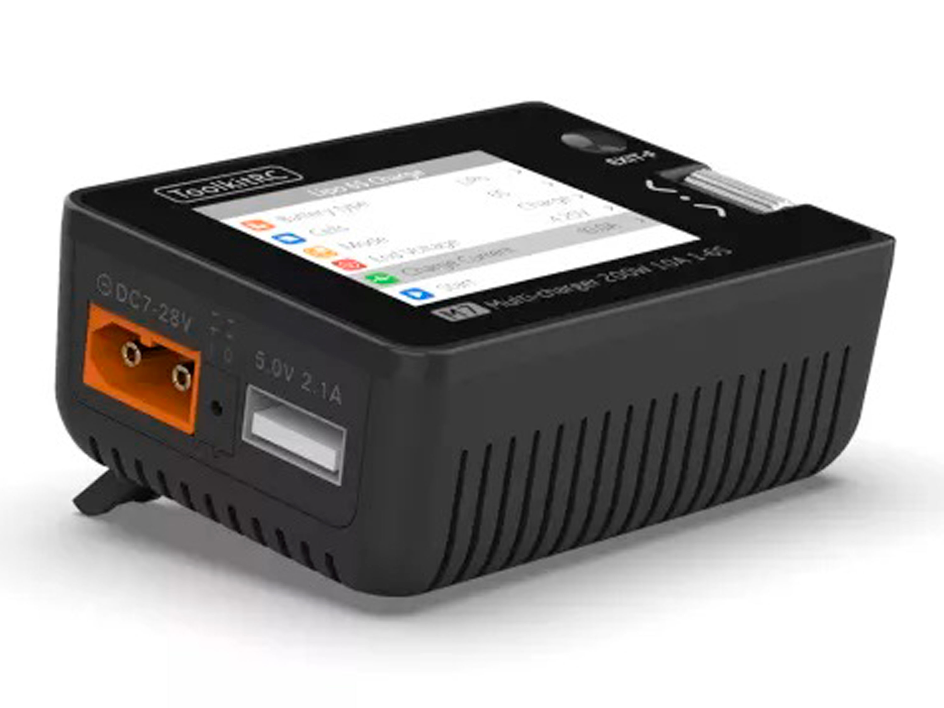 Компактное, многофункциональное, универсальное, зарядное устройство с максимальной мощностью в 200Вт и током заряда до 10А. Поддерживает режимы заряда/разряда всех типов аккумуляторов: LiPO, LiFe, LiIon, LiHV, NiMH, NiCd, Pb и режим хранения для литиевых аккумуляторов. Также ToolkitRC M7 имеет большое количество переменных параметров как для контроля аккумуляторов и самого зарядного: ограничение минимального входного напряжения, ограничение входной мощности, установка безопасной температуры и безопасного времени заряда, спящий режим и многое другое. Управление осуществляется с помощью удобного металлического ролика, а меню отображается на цветном и ярком дисплее IPS. Есть возможность регулировки яркости дисплея, а также возможность выбора ночной (темной) и дневной (светлой) темы. По сравнению с большинством зарядных устройств ToolkitRC M7 отличается большим количеством дополнительных режимов и функций: