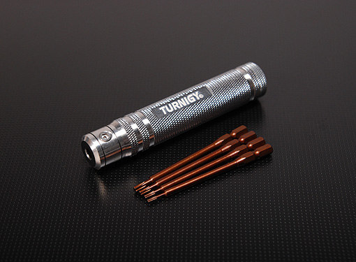 Набір викруток Turnigy включає легкосплавну ручку з ковпачком і 4 взаємозамінні насадки які зберігаються в самій ручці. Всі насадки є загартовані, що виключає можливість скручування чи провертання насадок при відкручуванні/закручуванні болтів.