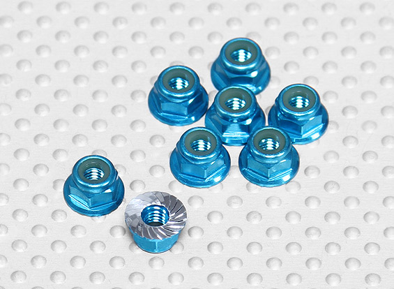 Анодована алюмінієва гайка М4 з нейлоновим фіксатором і зазубреною прижимною площиною (синя)