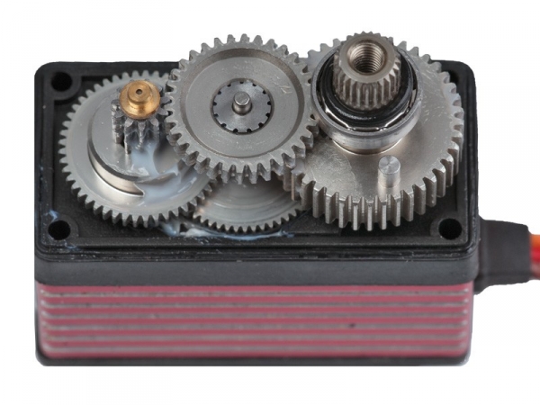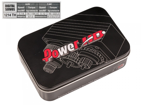 Сервомашинка Power HD-1214TH є цифровою і спеціально створена для моделей, де основною умовою для сервоприводу є його довговічність і висока надійність. Сервопривід незамінний на радіокерованих авіамоделях з ДВЗ і різних класах автомоделей. Встановлено шестерні, виготовлені за спеціальною технологією. Так, на шестерні наносяться шари титану, які сильно збільшують міцність останніх. Використання в таких сервоприводах двигунів, які здатні працювати без вимкнення дуже довго і розраховані на великі навантаження збільшило швидкість переміщення і зусилля, які створює рульова машинка. Також стає можливим збільшувати напругу живлення серводвигуна і застосовувати в якості джерела живлення Li-Po АКБ без BEC. Технічні характеристики: - Зусилля (6В): 14кг/см;