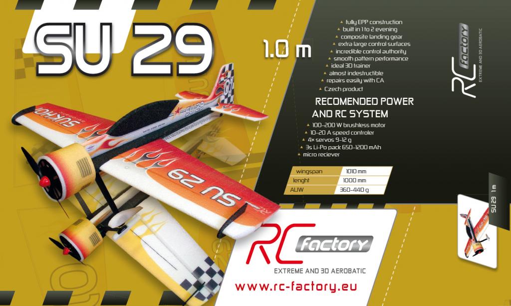 Набір для виготовлення акробатичної моделі літака SU 29 EPP. Основним матеріалом, з якого виготовлені всі деталі, є спеціальний матеріал EPP. Цей матеріал відрізняється відмінною вагою і високою стійкістю до пошкоджень. Модель, зібрану з EPP практично неможливо пошкодити - він не ламається і не мнеться , а можливі розриви легко і швидко склеюються за допомогою будь-якого Циакріну.