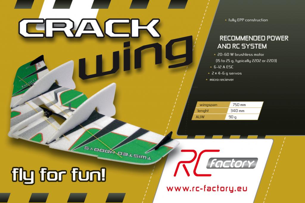 Нові моделі серії Crack "FAN" створені для забави та відпочинку. Розмах крила 750мм, який вимагає оснащення 20-60Вт безколекторним двигуном та двома сервомашинками. Це традиційно висока якість і простота конструкції. Ці моделі призначені для польотів в залі і на вулиці, старту з руки, і не мають шасі. Технічні характеристики: