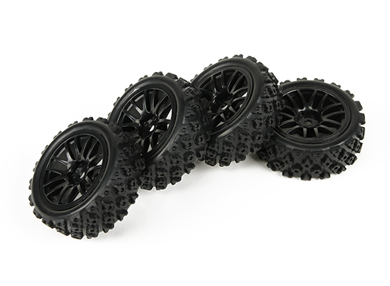 Комплект коліс HobbyKing (4 штуки) встановлюється на автомоделі 1/10. Вироби виготовлені на основі високоякісної ралійної гуми, яка встановлена на дисках чорного кольору з 7-а міцними здвоєними спицями. Технічні характеристики: - Посадочний шестигранник (Hex): 12мм;