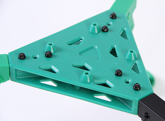 Рама для трикоптера RotorBits. Карбонові промені і литі частини з склонаповненого нейлону роблять її надзвичайно міцною. Яскраво забарвлена центральна пластина гексакоптера оздоблена монтажними опорами для кріплення польотного контролера, розташованими на відстані 45х45мм. Також є можливість установки інших комплектуючих і частин Bits.