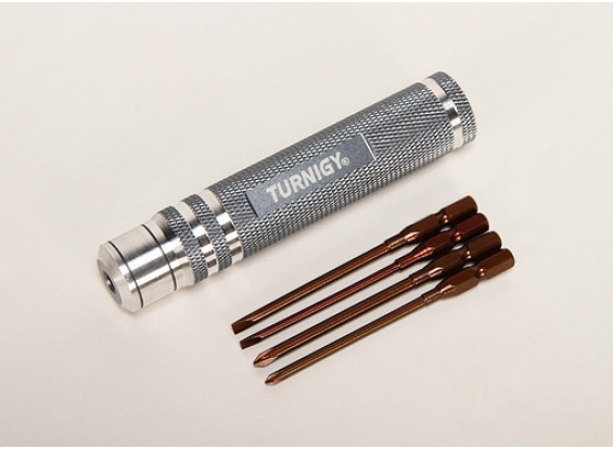 Набір викруток Turnigy включає легкосплавну ручку з ковпачком і 4 взаємозамінні насадки (2 хрестовидні та 2 плоскі) які зберігаються в самій ручці. Всі насадки є загартовані, що виключає можливість скручування чи провертання насадок при відкручуванні/закручуванні гвинтів.