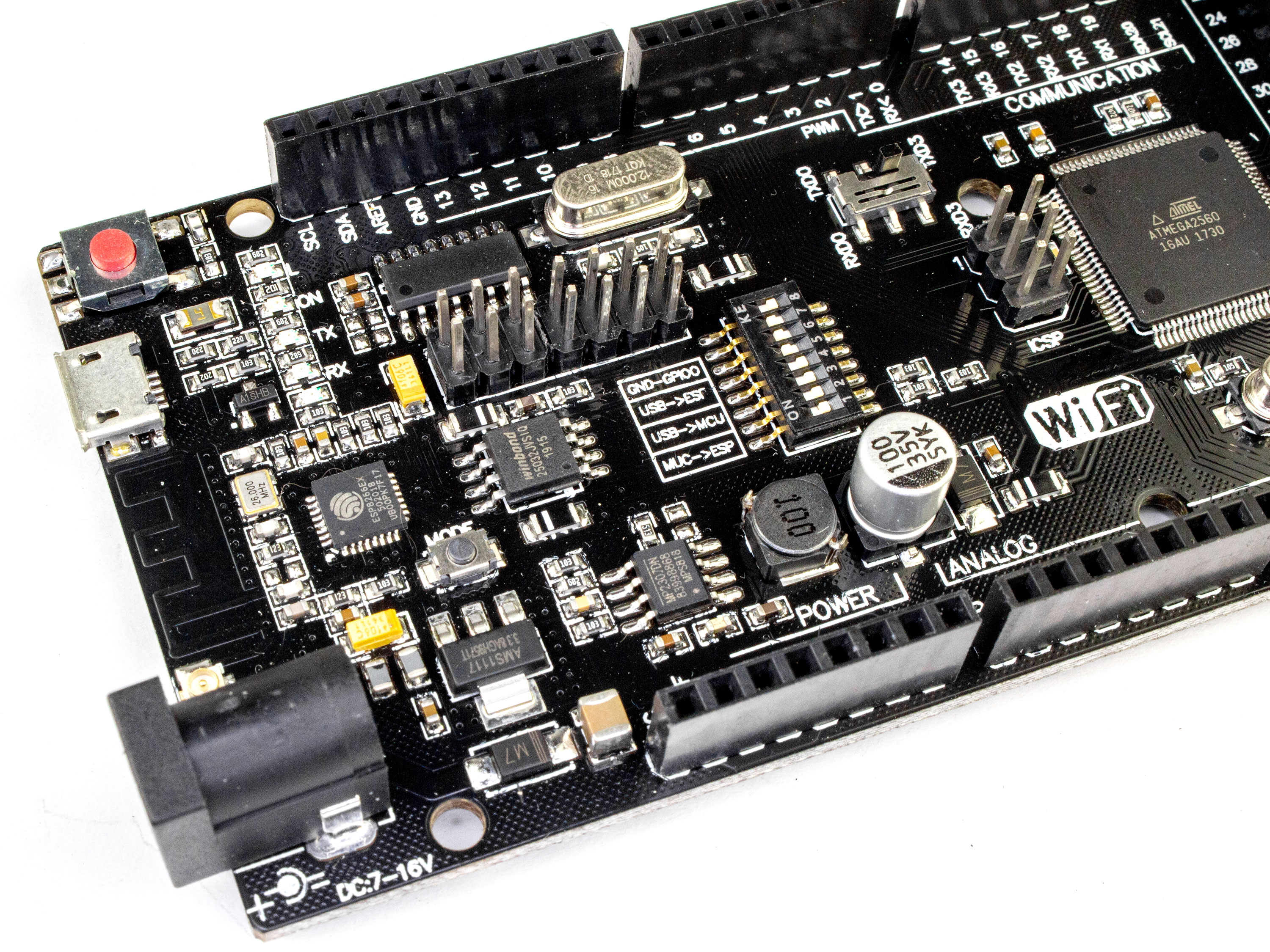 Це плата на основі популярного контролера Arduino Mega 2560 але з вбудованим Wi-Fi модулем ESP8266. Контролер і модуль повністю сумісні і можуть працювати як в парі, так і окремо. На платі встановлений 8-піновий перемикач режимів роботи модулів. Пата має форм-фактор контролера Mega 2560, що робить її універсальною для підключення різних модулів а також сумісною з усіма платами розширення (shield) розробленими для плат Arduino UNO і Duemilanove. Плата підключається за допомогою кабеля USB-microUSB. Програмується за допомогою програмного забезпечення ArduinoIDE. Технічні характеристики: