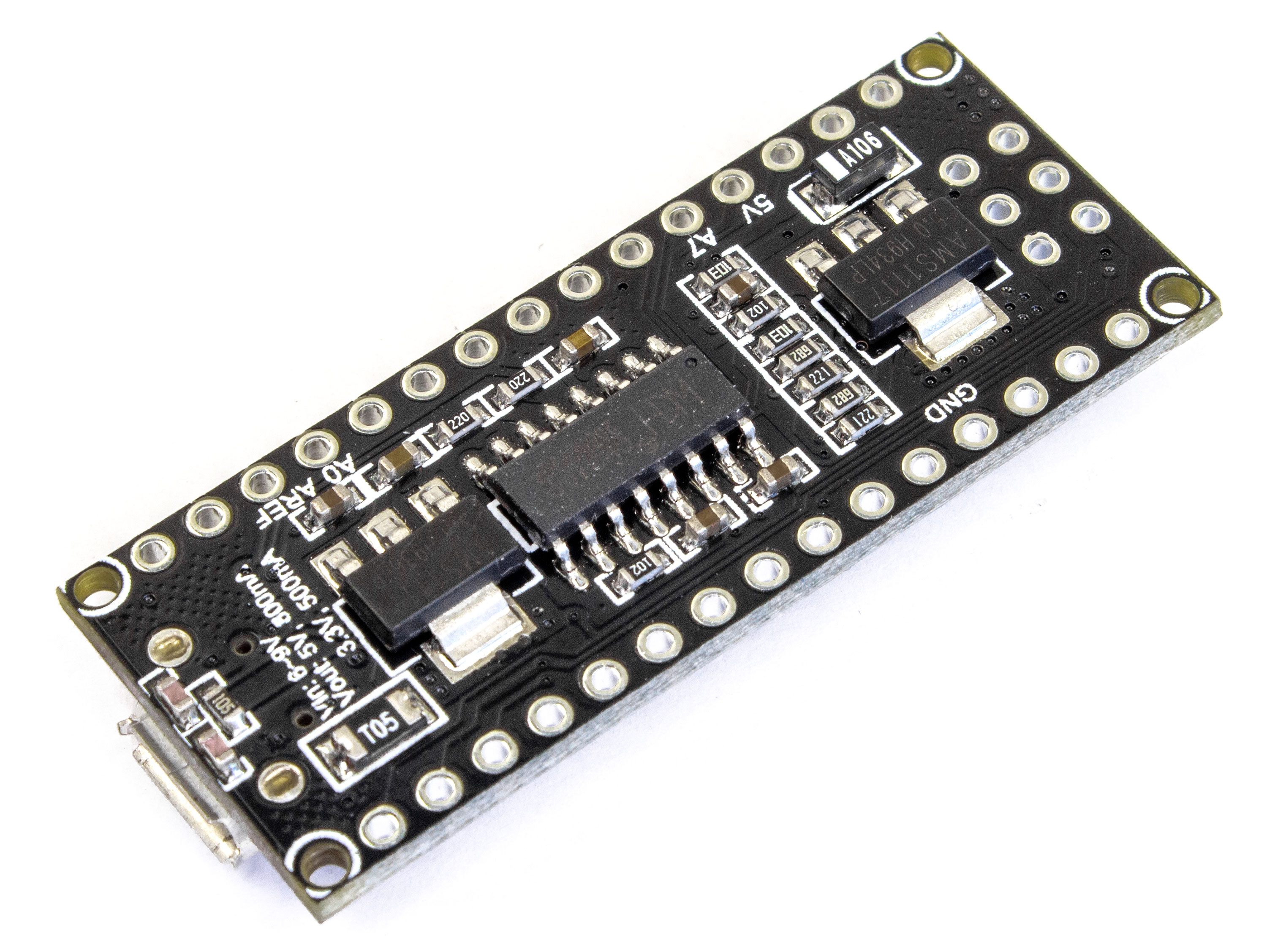 Репліка оригінальної плати Arduino Nano. Плату зроблено на основі мікроконтролера ATmega328P. Контролер RobotDyn відрізняється від інших Arduino Nano наявністю стабілізаторів AMS1117 для напруги 5В і 3.3В, наявністю двох кварцових резонаторів 12МГц і 16МГц для стабільнішої роботи та роз'ємом Micro-USB для підключення до комп'ютера. Живлення плати можливе через USB або з використанням зовнішнього джерела живлення (пін VIN), в цьому випадку напруга живлення може складати 6-12В, оскільки плата має вбудований стабілізатор або 5В стабільного зовнішнього живлення (пін "5V"). Програмується за допомогою програмного забезпечення ArduinoIDE. Технічні характеристики: