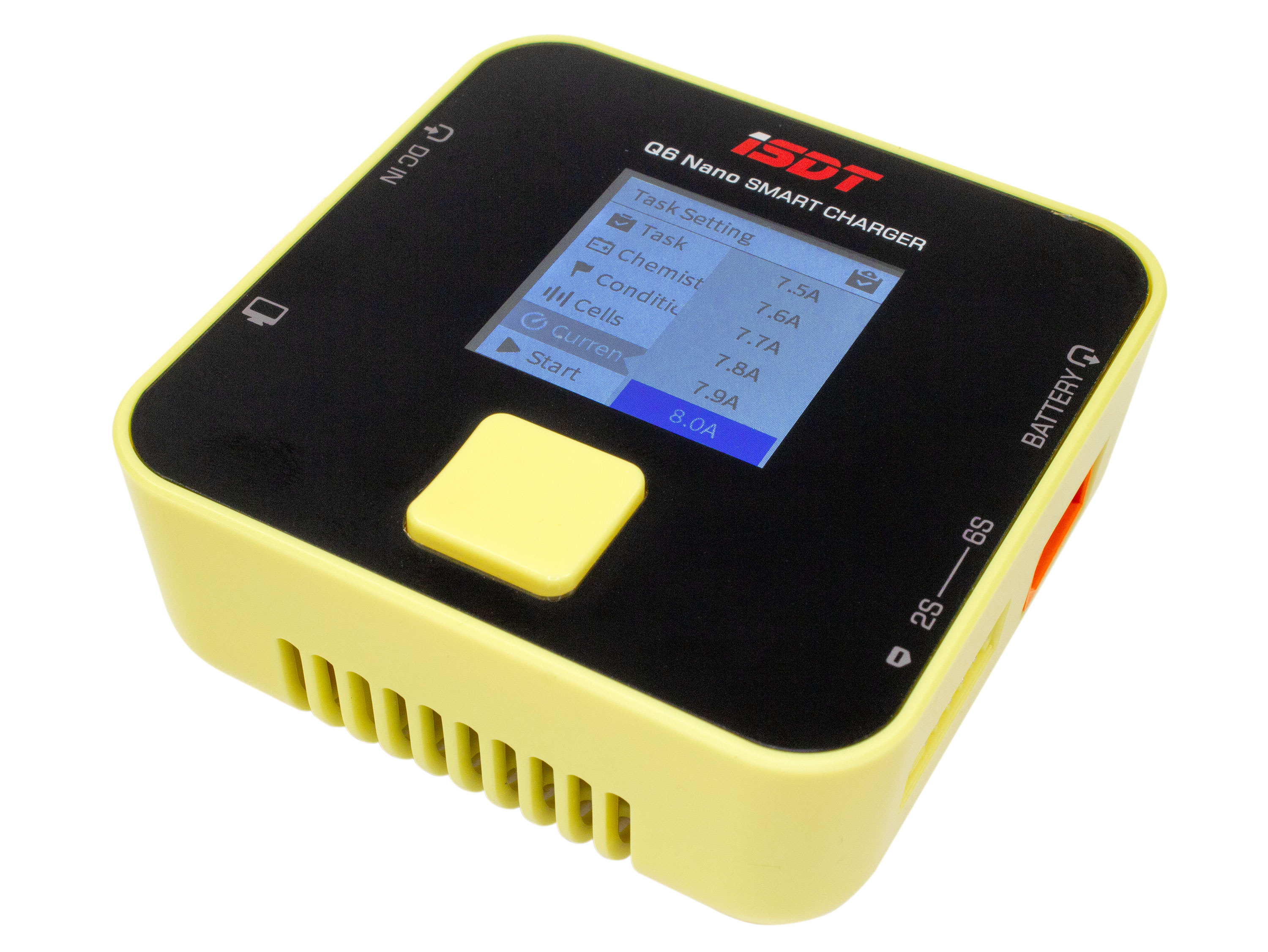 iSDT Q6 Nano - це оновлена версія універсальних зарядних пристроїв серії Q від виробника iSDT. Q6 Nano у порівнянні з Q6 Pro має менші розміри, а також має функцію лабораторного блоку живлення та функцію знищення акумулятора. Також виробник замінив порт для оновлення прошивки. Тепер Вам не потрібно купувати додатковий програматор, достатньо лише під'єднати зарядний пристій до комп'ютера за допомогою microUSB кабелю. Керування здійснюється за допомогою однієї багатофункціональної кнопки. Вона виконує три функції: "вверх", "вниз" та "вибір". При натисканні верхньої частини спрацьовує функція "вверх", нижньої - "вниз", центральної - "вибір". Також "вибір" спрацьовує якщо затиснути "вверх" або "вниз" довше ніж на 1 секунду. Для зручності виробник в меню вибору струму додав функцію запам'ятовування трьох останніх обраних параметрів. Встановлено кольоровий IPS дисплей з діагоналлю 1.5 дюйма та з кутом огляду 178°, що забезпечує чітке та якісне зображення, навіть у яскраву сонячну погоду. Швидкісні якісні вентилятори і продуманий дизайн повітряного каналу для забезпечення оптимального охолодження і зменшення розміру зарядки. Особливості: