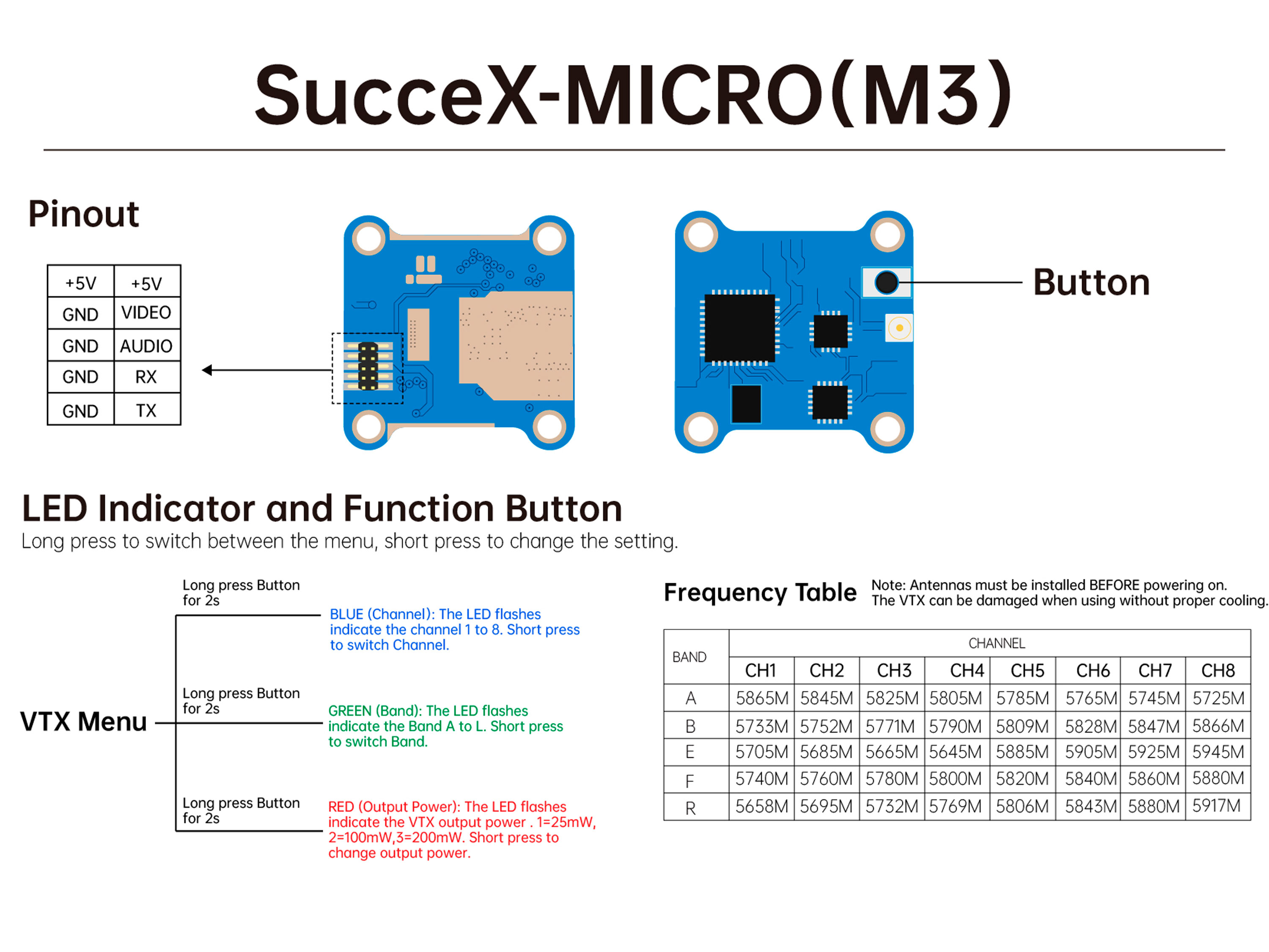 Відеопередавач iFlight SucceX Micro з максимальною потужністю до 200мВт. LED-індикація статусу роботи передавача, а також обраного каналу і частоти. Технічні характеристики: - Робоча частота: 5.8ГГц;