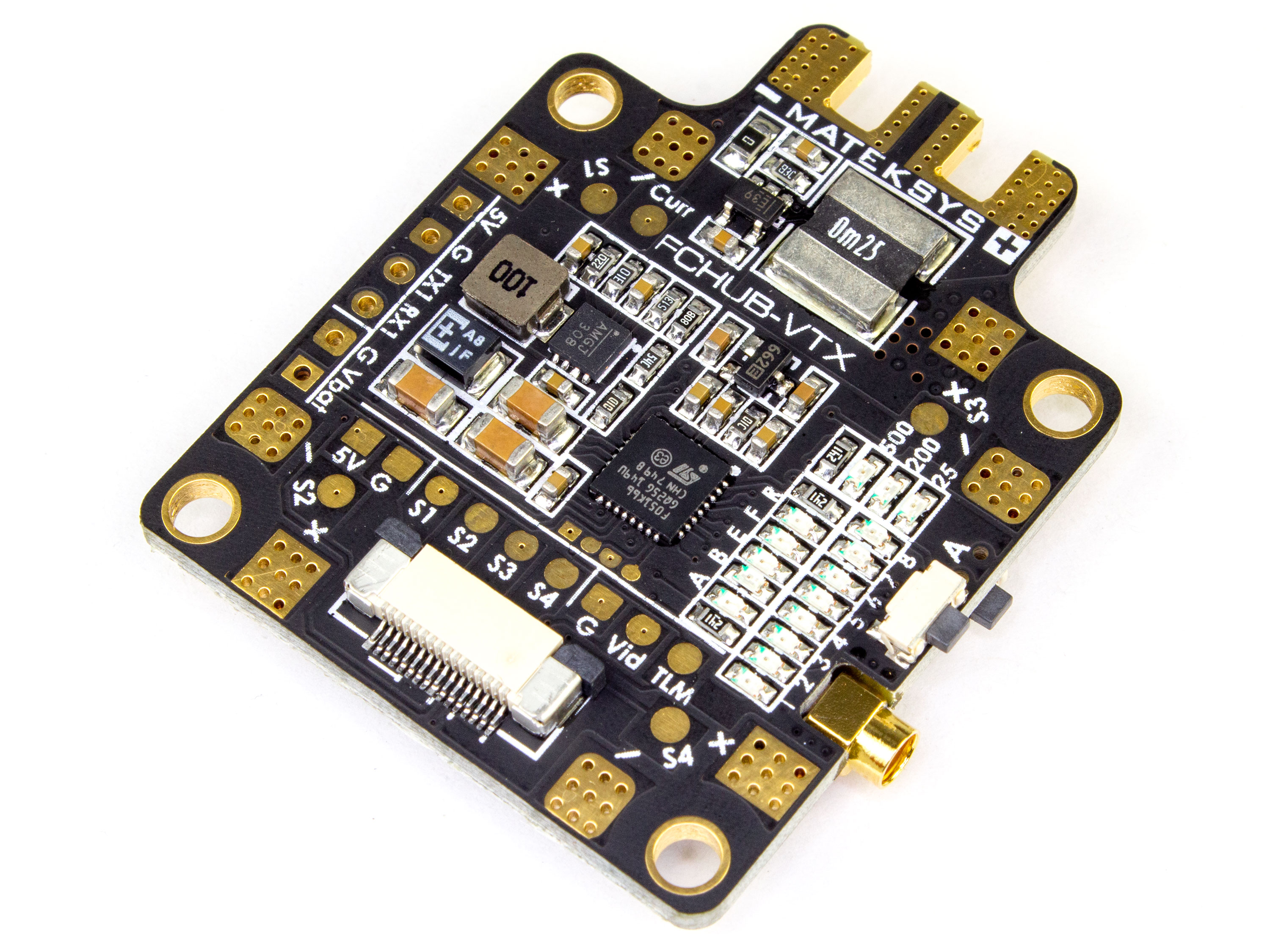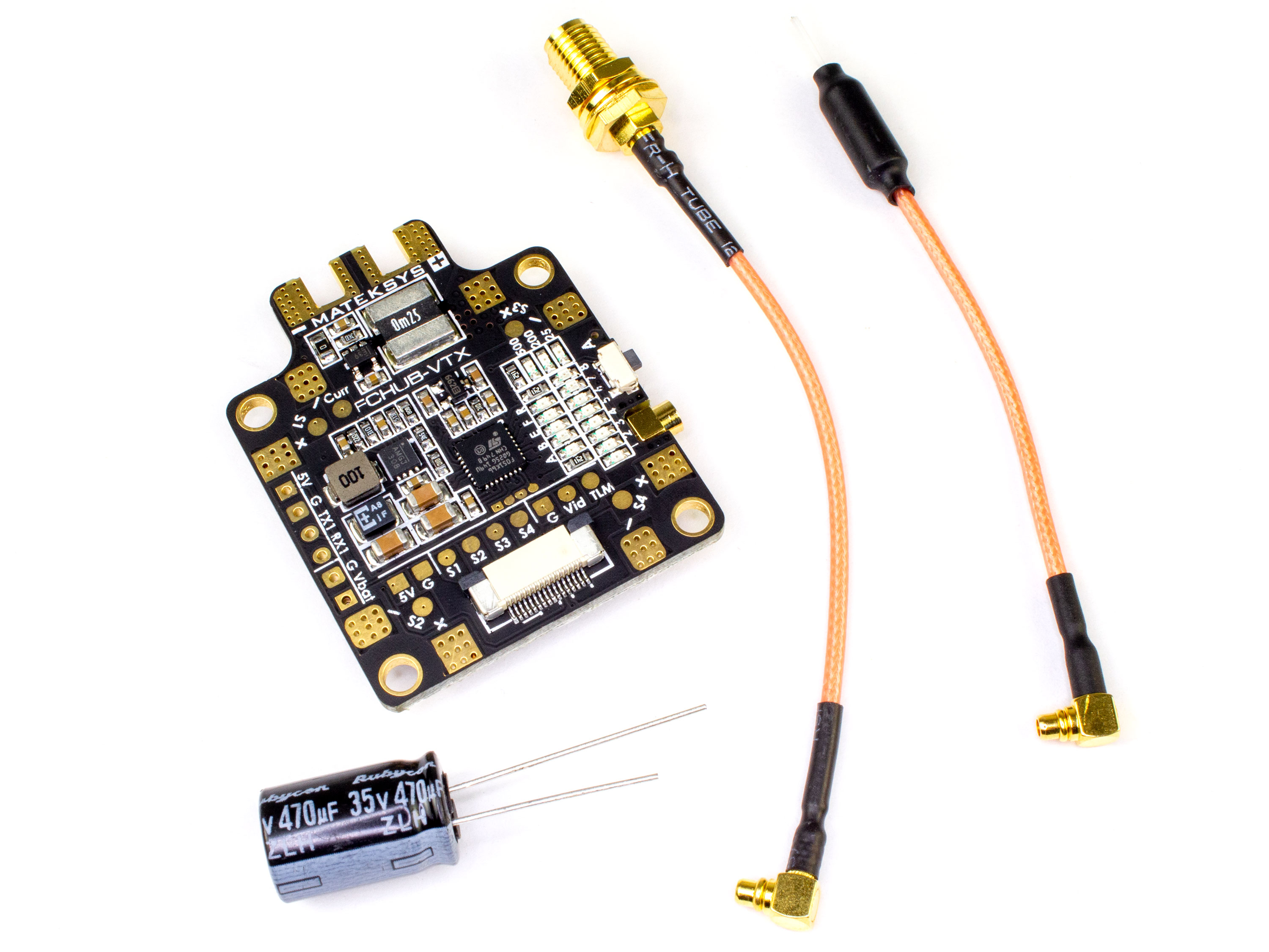 Matek FCHUB-VTX - это плата распределения питания (PDB) и видео передатчик (5.8ГГц) два в одном. PDB имеет 4 пары контактных площадок для подключения максимум до четырех регуляторов (до 120А) и встроенный BEC 5В/1А для дополнительного питания. Видеопередатчик на 40 каналов с возможностью выбора частоты и с поддержкой настроек и обновления прошивки через меню Betaflight. На плате имеется кнопка и LED индикаторы для переключения каналов и мощности. Разъем для подключения антенны заменен из стандартного RP-SMA на MMCX. Плата дополнительно комплектуется конденсатором Rubycon (35В 470uF) для сглаживания пульсаций напряжения по питанию. FCHUB-VTX совместим со всеми современными платами управления (контроллерами). Официальная страница на сайте Matek Systems. Технические характеристики: