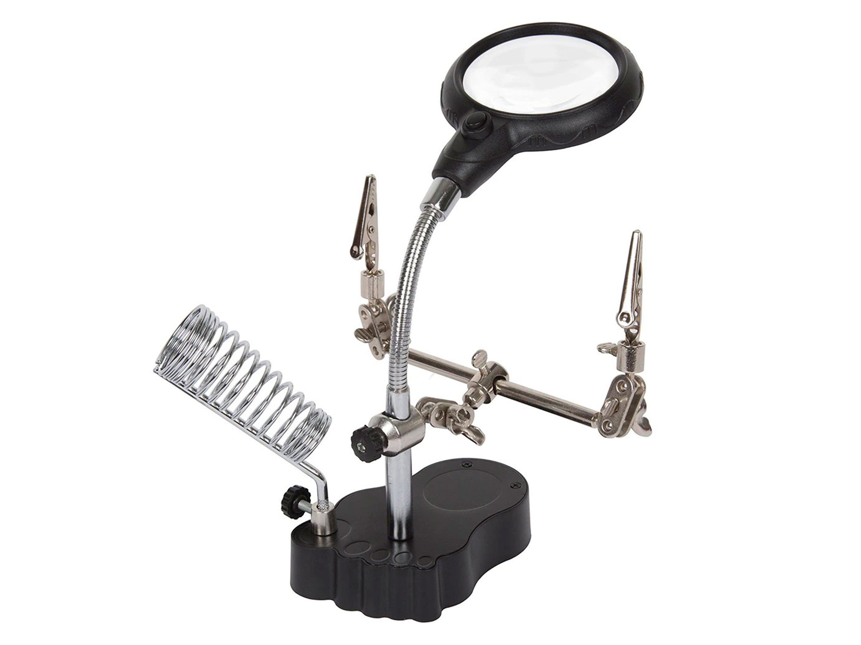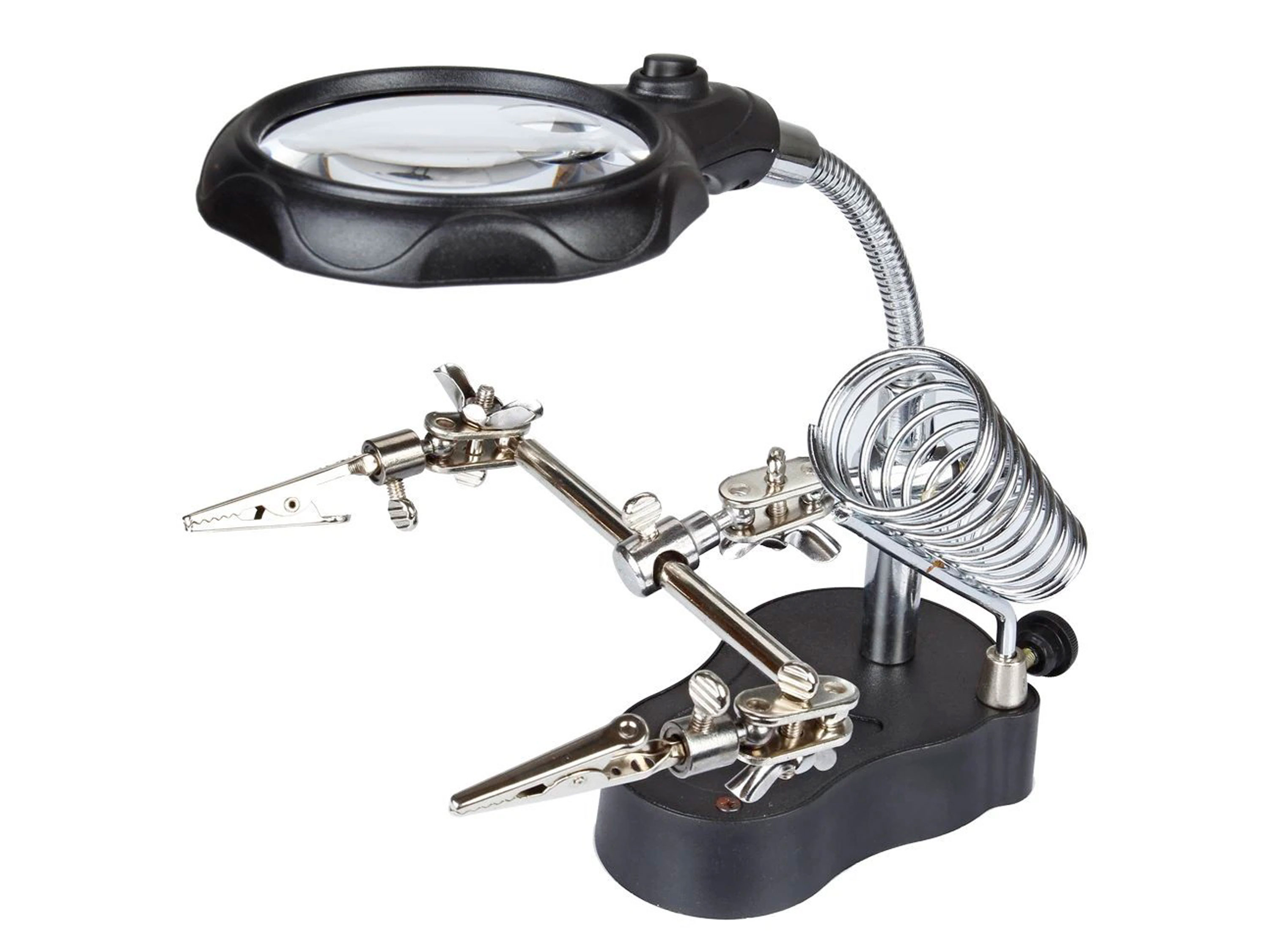 Держатель плат с подставкой под паяльник. Увеличительная линза (лупа) оснащена LED-подсветкой на батарейках. Технические характеристики: - Количество держателей (крокодилов): 2шт;