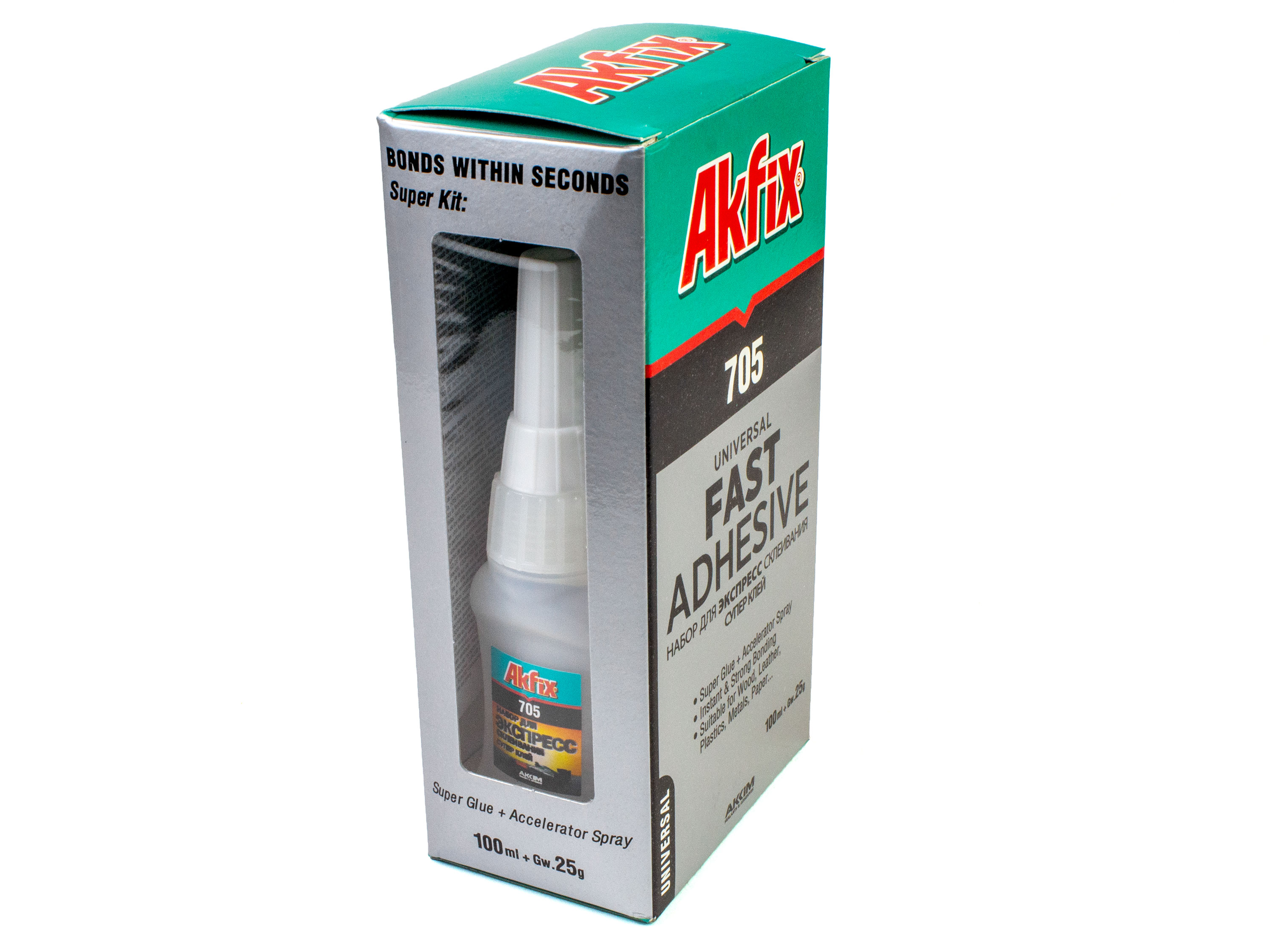 Двокомпонентний клей Akfix 705 складається з вузького високоякісного гелю цианоакрилату (25г) і зручного для нанесення аерозолю активатора (100мл), потрібен для поклейки різних матеріалів, наприклад, деревини і матеріалів, що її містять, каучуку, шкіри, багатьох пластиків і так далі. Клей відрізняється високою надійністю створюваного з'єднання, дуже швидко сохне. Можливе нанесення на вертикальні поверхні. Перед нанесенням очистіть, знежирте і просушіть поверхню. Потім рекомендується розпилити активатор на будь-яку з поверхонь і дозволити йому випаруватися. Далі на іншу поверхню наносимо клей і притискаємо поверхні, тримаємо їх в притиснутому стані кілька секунд. Технічні характеристики: - Основа: етил-2-цианоакрилат;