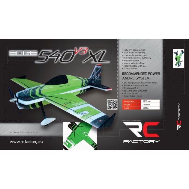 Нова модель Edge XL від Чеського виробника RcFactory - це напівкопія справжнього літака зі змагань Red Bull Air Race. Максимально зберігши оригінальний вигляд справжнього пілотажного літака, дизайнери RcFactory створили модель, яка літає так само як модель Veloxity легендарного Cody Wojcik. Edge XL відрізняється неймовірно швидким та чітким відкликом на всі елементи керування. Технічні характеристики: