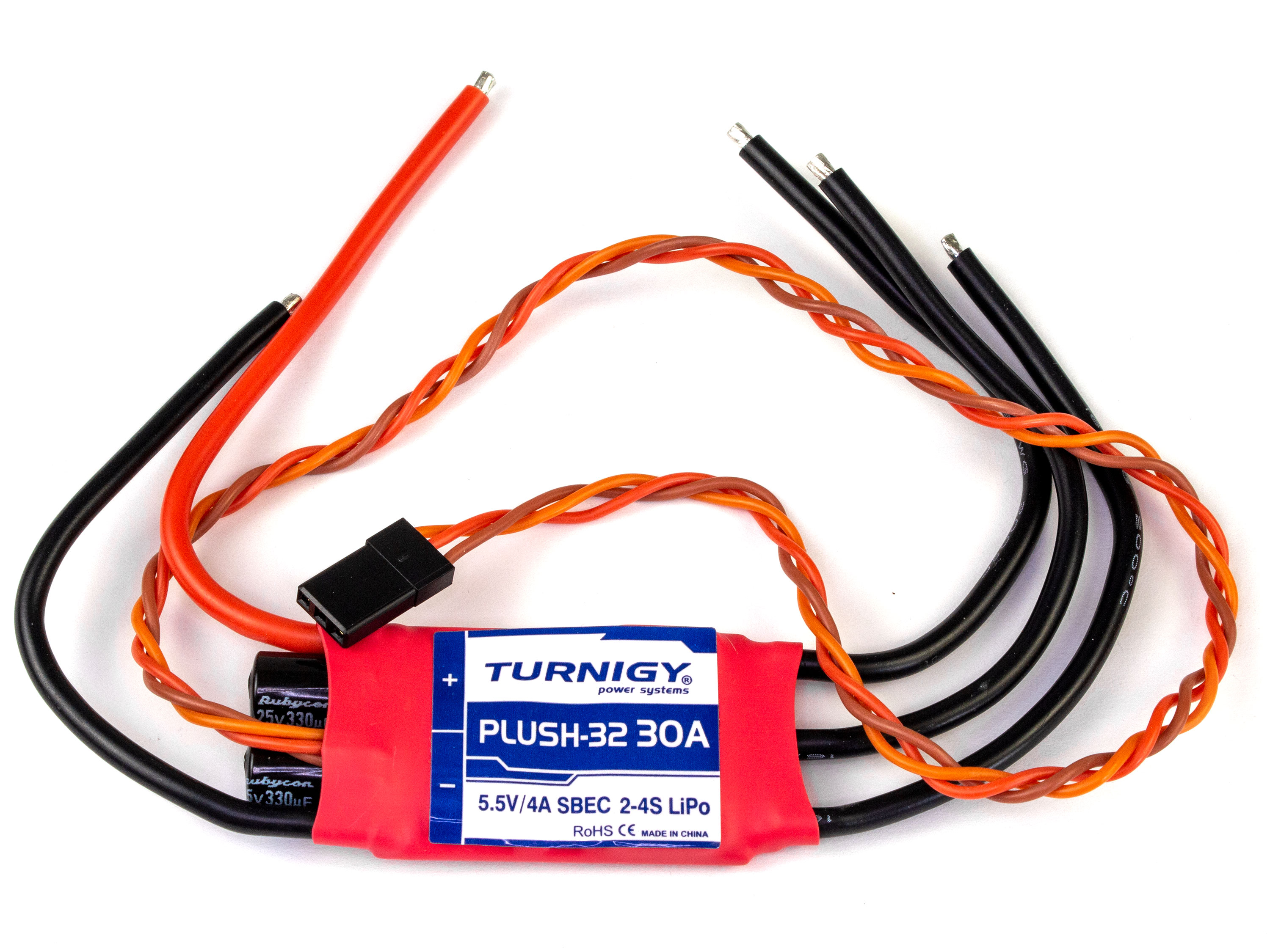 Нове покоління безколекторних регуляторів Turnigy Plush-32. Plush-32 оснащений новим 32-бітним контролером ARM, завдяки чому регулятор має ще кращий та швидший відклик в порівнянні зі серією Plush. Усі параметри регулятора (окрім вкл/викл. гальм) налаштовуються за допомогою програмної карти Plush-32. Налаштування Вкл/викл: Параметр включення та виключення гальм налаштовується за допомогою радіопередавача. Для цього потрібно підключити регулятор до приймача, виставити ручку газу в центральне положення та подати живлення на регулятор після чого він повинен ініціалізуватись подавши послідовні сигнали та продовжити повторювати короткі одинарні сигнали - це означає що регулятор в режимі налаштування. Щоб увімкнути гальма потрібно ручку газу перевести в максимальне верхнє положення, щоб вимкнути потрібно ручку перевести в максимальне нижнє положення. Послідовні сигнали означають що регулятор налаштовано а наступні два короткі сигнали означають що регулятор готовий до використання. Технічні характеристики: