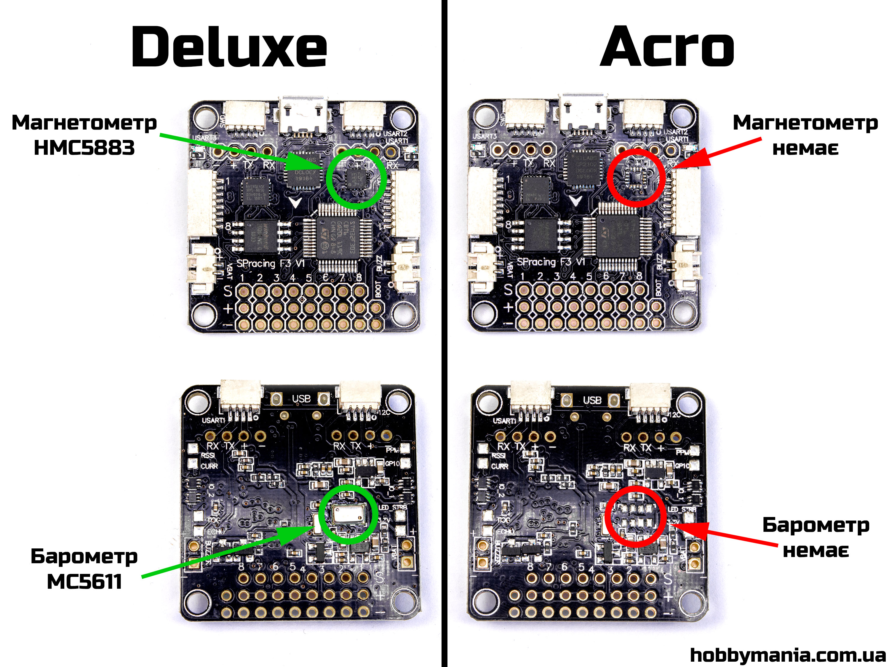 SP Racing F3 версія Deluxe має барометр (альтиметр) та компас (магнетометр). Для тих хто хоче використовувати коптер тільки для дронрейсінгу, кому не потрібно утримання напрямку та висоти, є такий самий контролер без барометра та компаса SP Racing F3 Acro (6DOF). Особливості: