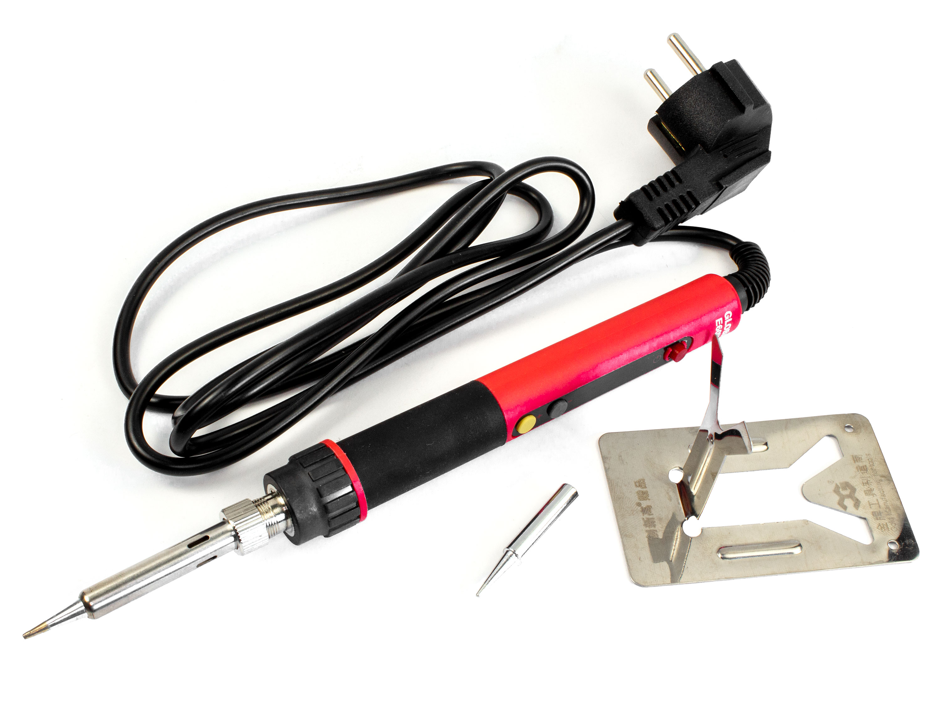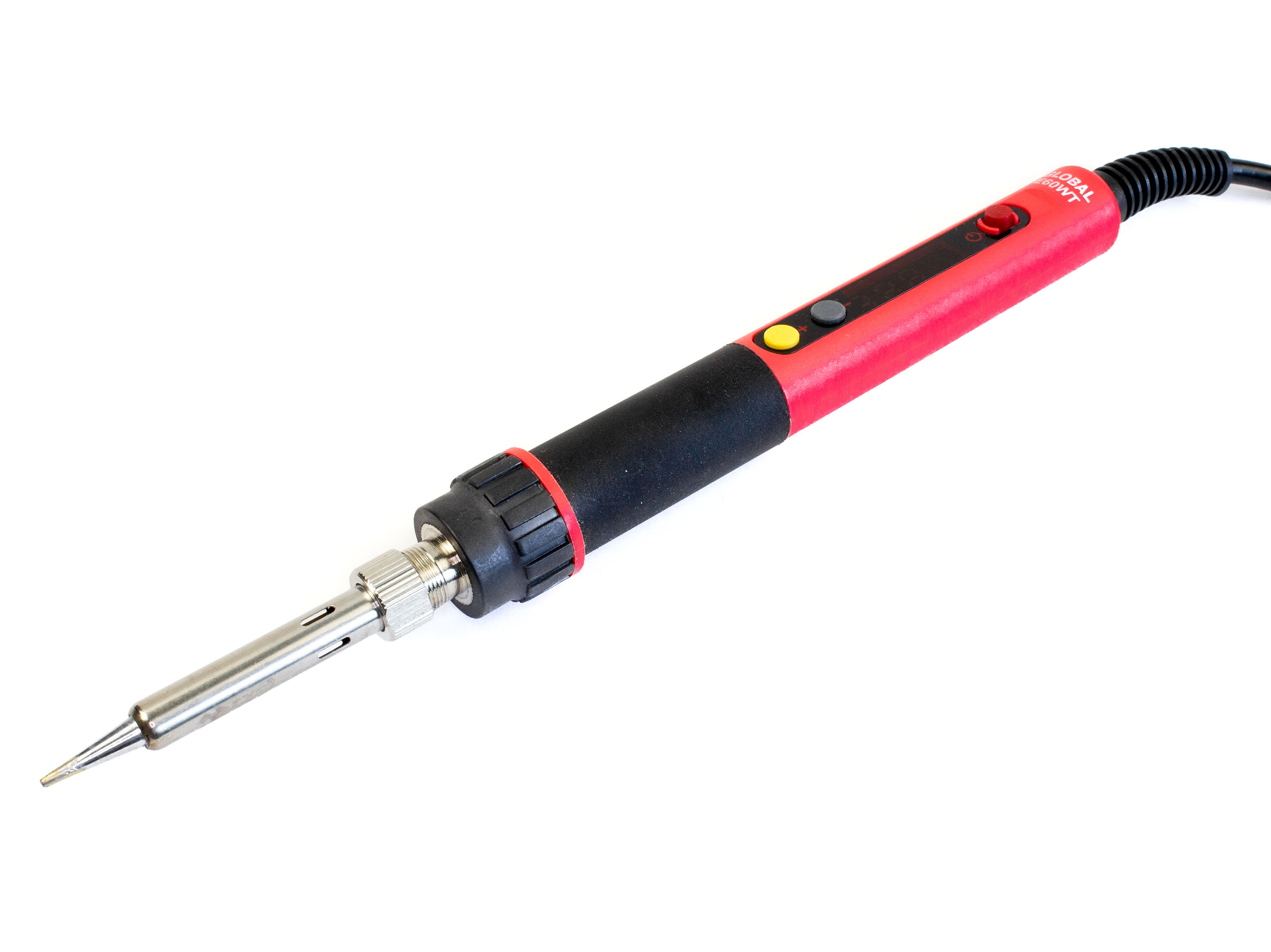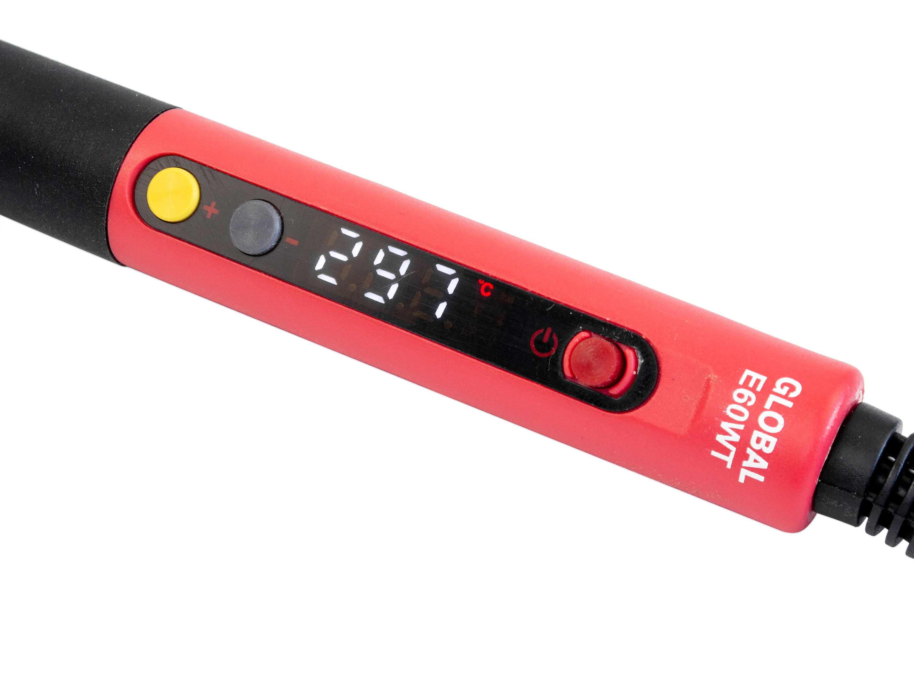 Паяльник CXG E60W з дисплеєм для контролю температури та можливістю її регулювання. Кнопка (+) для підвищення та кнопка (-) для пониження температури, а також кнопка червоного кольору для зручного включення або виключення паяльника. Ручка паяльника обладнана гумовою накладкою для зручного захвату. Час розігріву до температури 300°С скаладає всього 18 секунд. Потужність 60Вт дозволяє паяти дроти і контакти навіть великих діаметрів. Технічні характеристики: