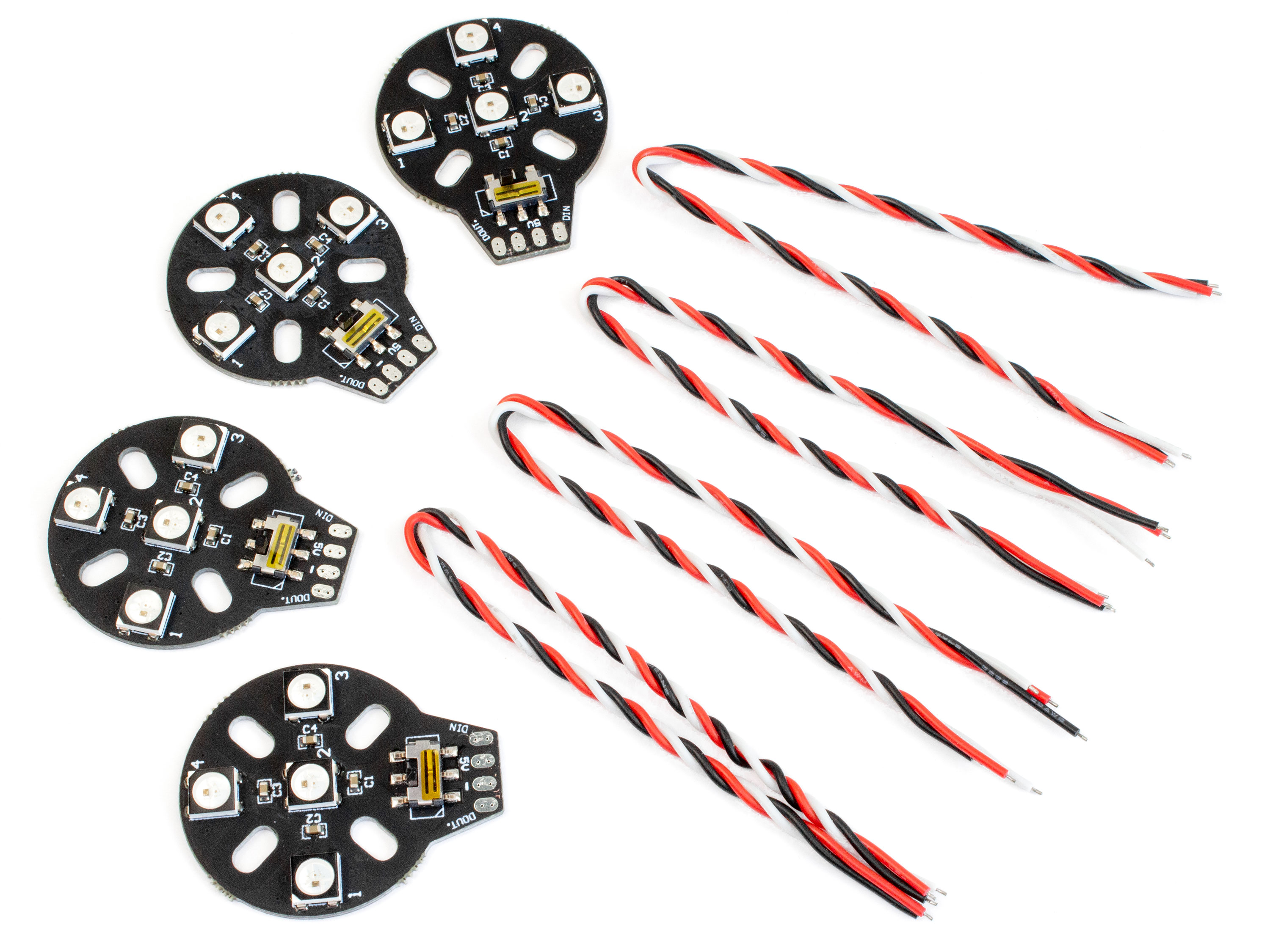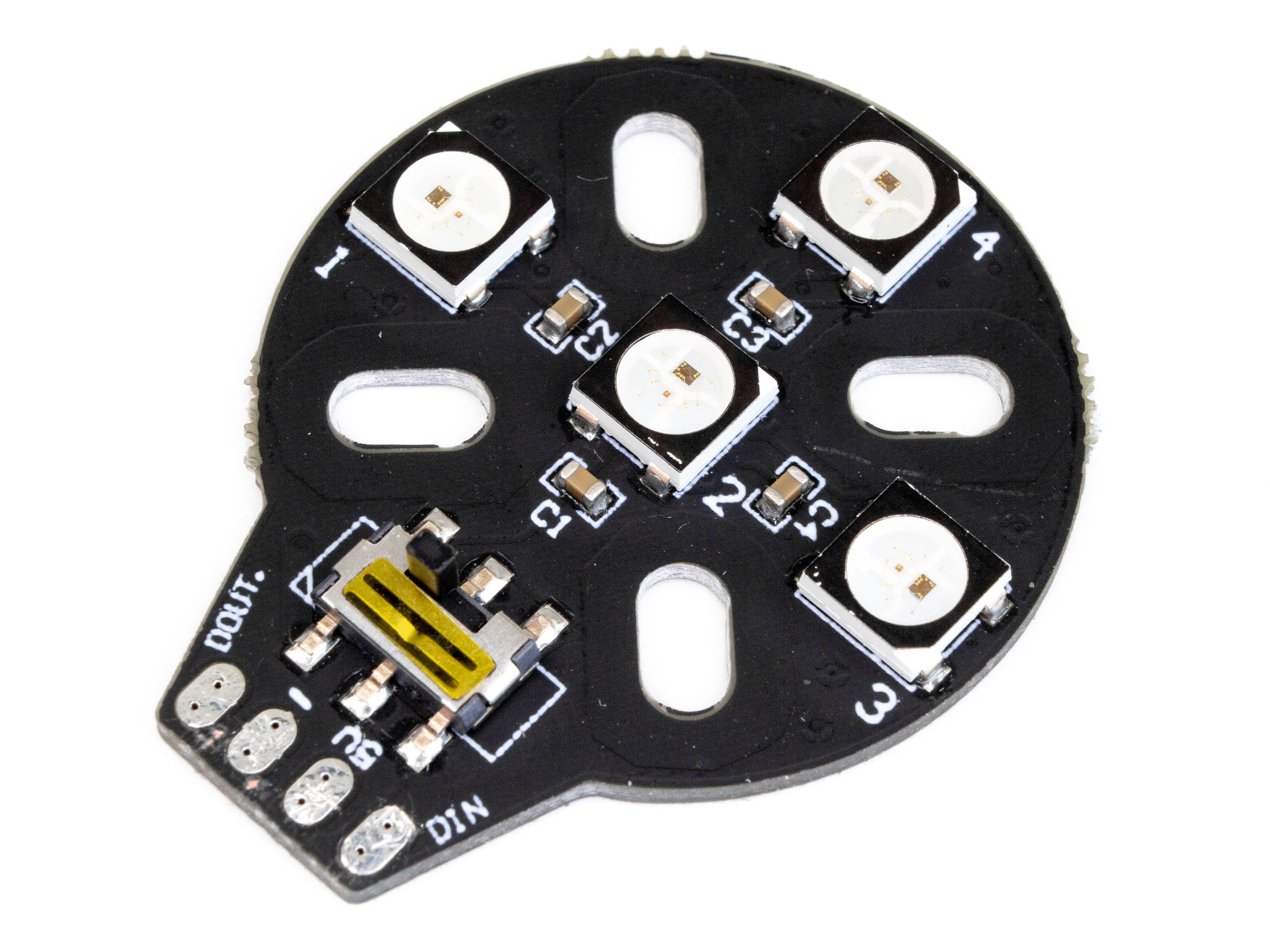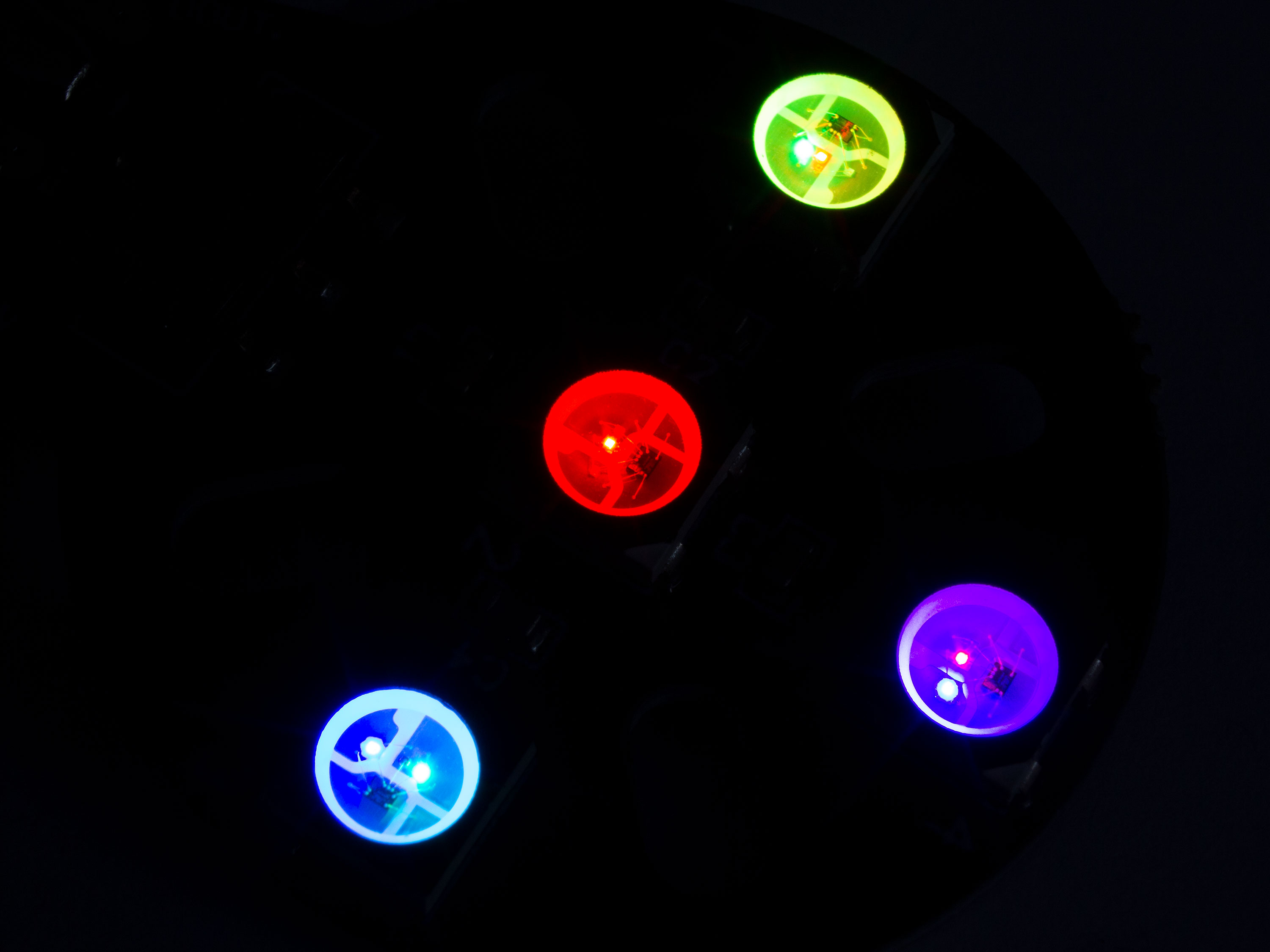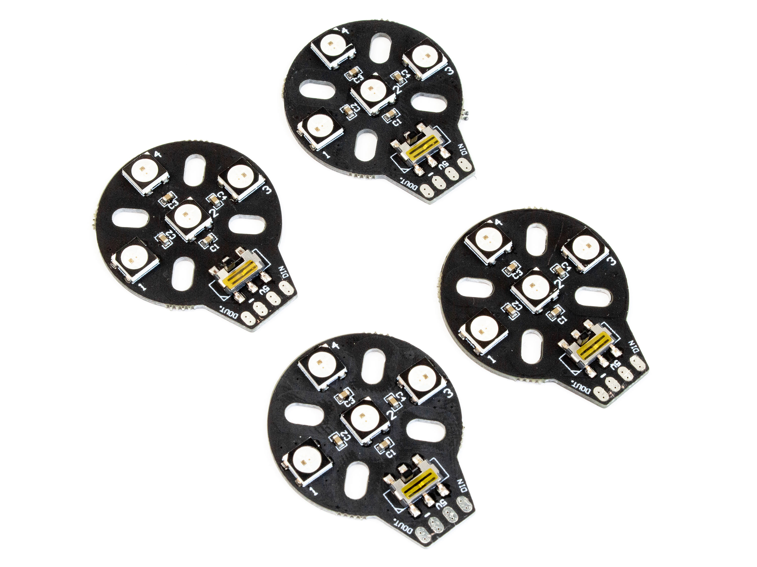 Набір з чотирьох плат діаметром 28мм. На платі вбудовано по чотири програмованих світлодіода RGB WS2812B у корпусі SMD 5050. Підсвітка під'єднюється і налаштовується за допомогою плати керування (польотного контролеру). На кожній платі є вмикач/вимикач для ручного включення або виключення світлодіодів. Отвори кріплення на платі сумісні з двигунами типорозміру 18хх та 22хх. Технічні характеристики: - Робоча напруга: 5В;