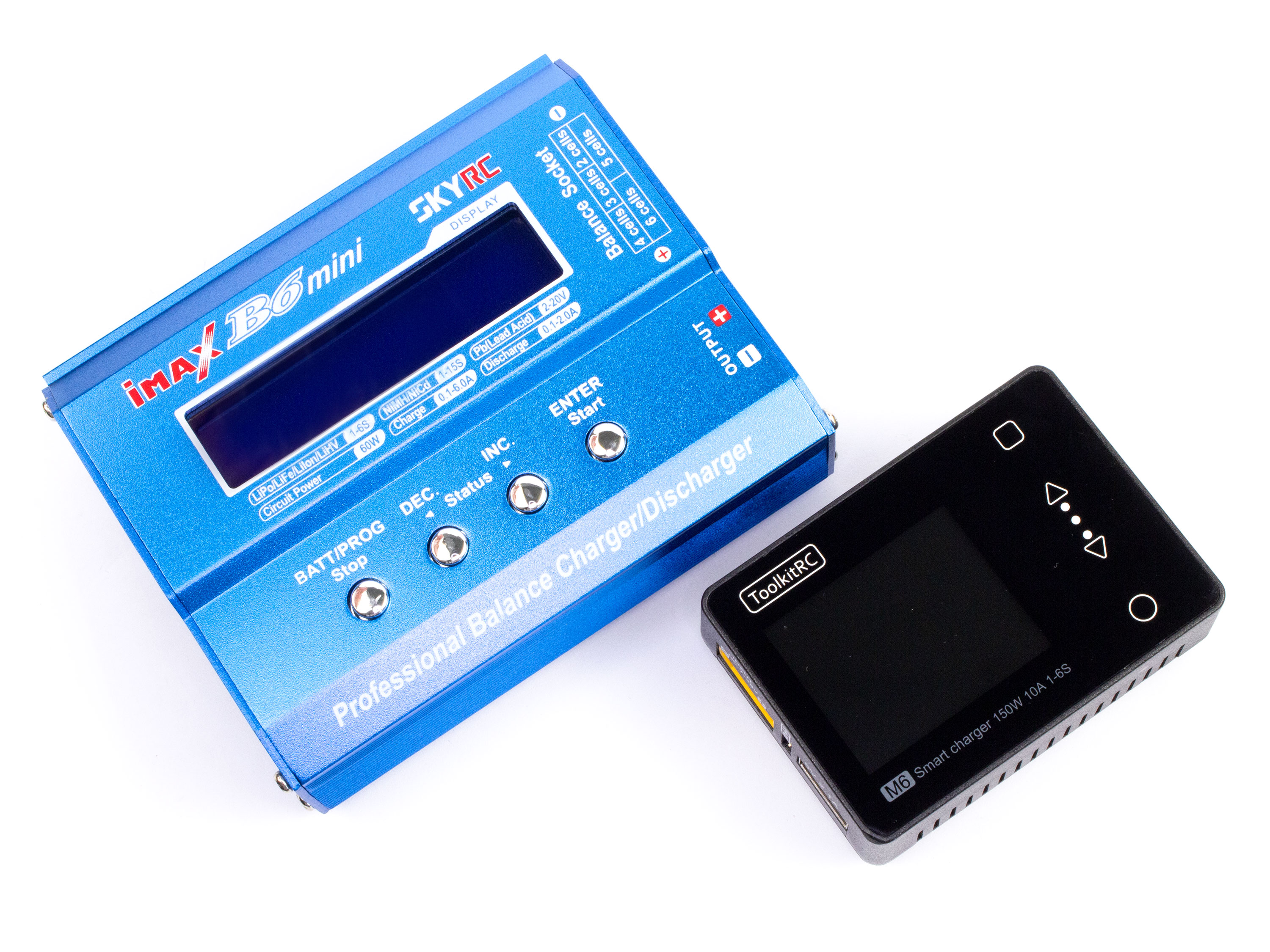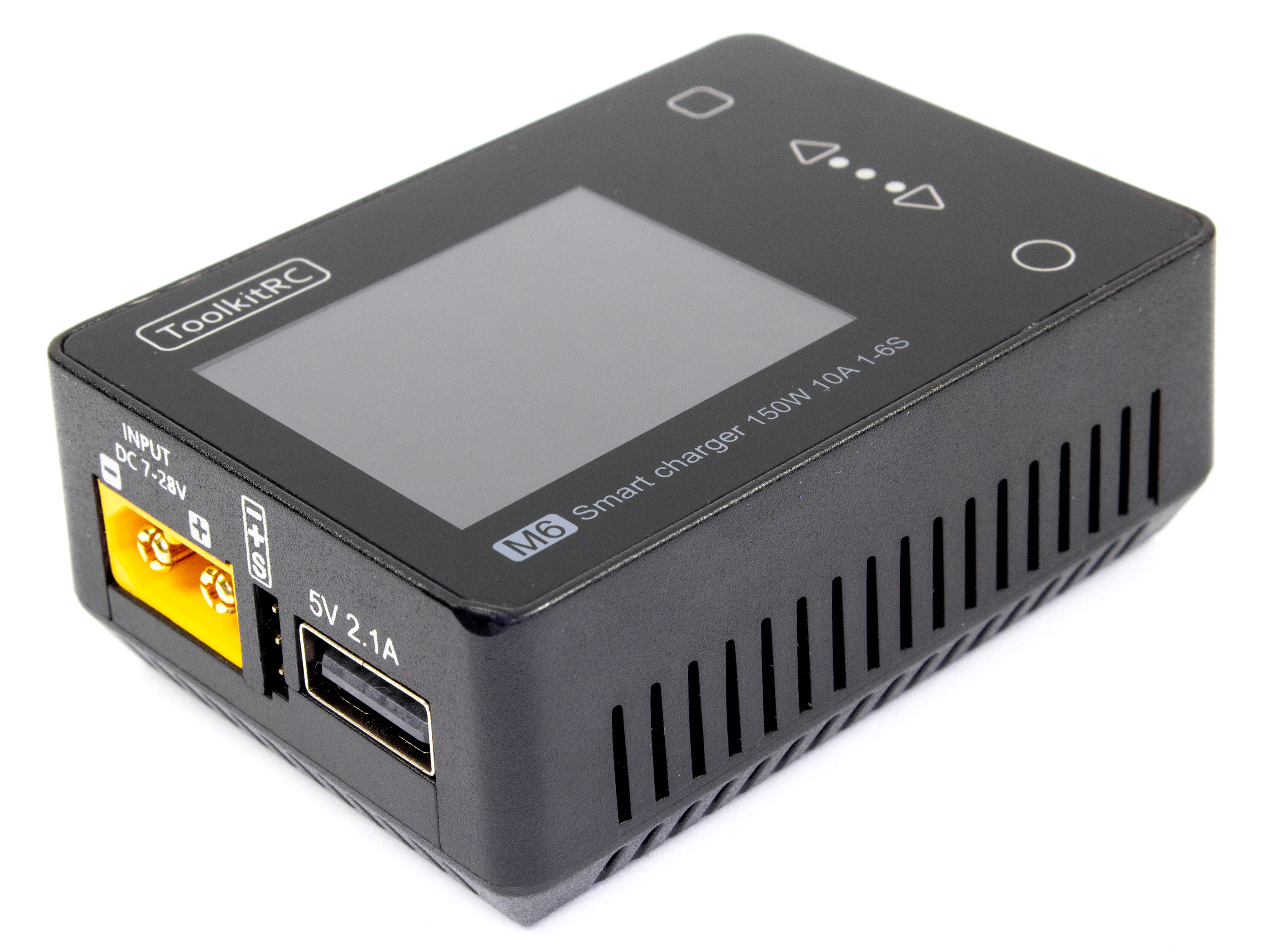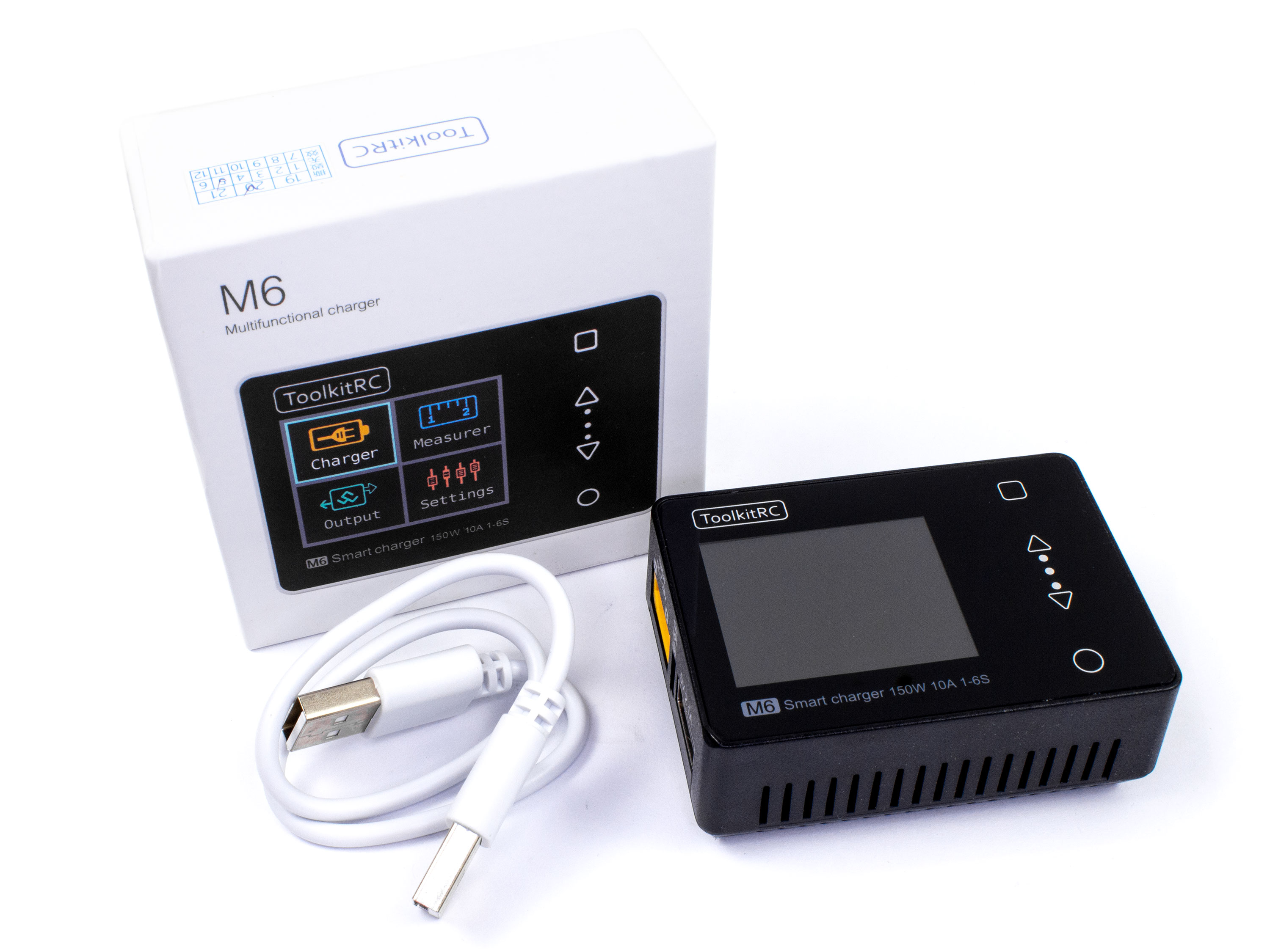 Компактний, багатофункціональний, універсальний, зарядний пристрій з максимальною потужністю у 150Вт та струмом заряду до 10А. ToolkitRC M6 підтримує режими заряду/розряду для усіх типів акумуляторів: LiPO, LiFe, LiIon, LiHV, NiMH, NiCd, Pb та режим зберігання для літієвих акумуляторів. Також має велику кількість змінних параметрів як для контролю акумуляторів та і для самого зарядного: обмеження мінімальної вхідної напруги, обмеження вхідної потужності, встановлення безпечної температури та безпечного часу заряду, сплячий режим та багато іншого. Керування здійснюється за допомогою зручних сенсорних кнопок а меню відображається на кольоровому і яскравому дисплеї. Є можливість регулювання яскравості дисплею а також можливість вибору нічної (темної) та денної (світлої) теми. Для під'єднання живлення і акумуляторів, на вході та виході встановлено роз'єм XT60. В порівнянні з більшістю зарядних пристроїв ToolkitRC M6 відрізняється великою кількістю додаткових режимів та функцій: