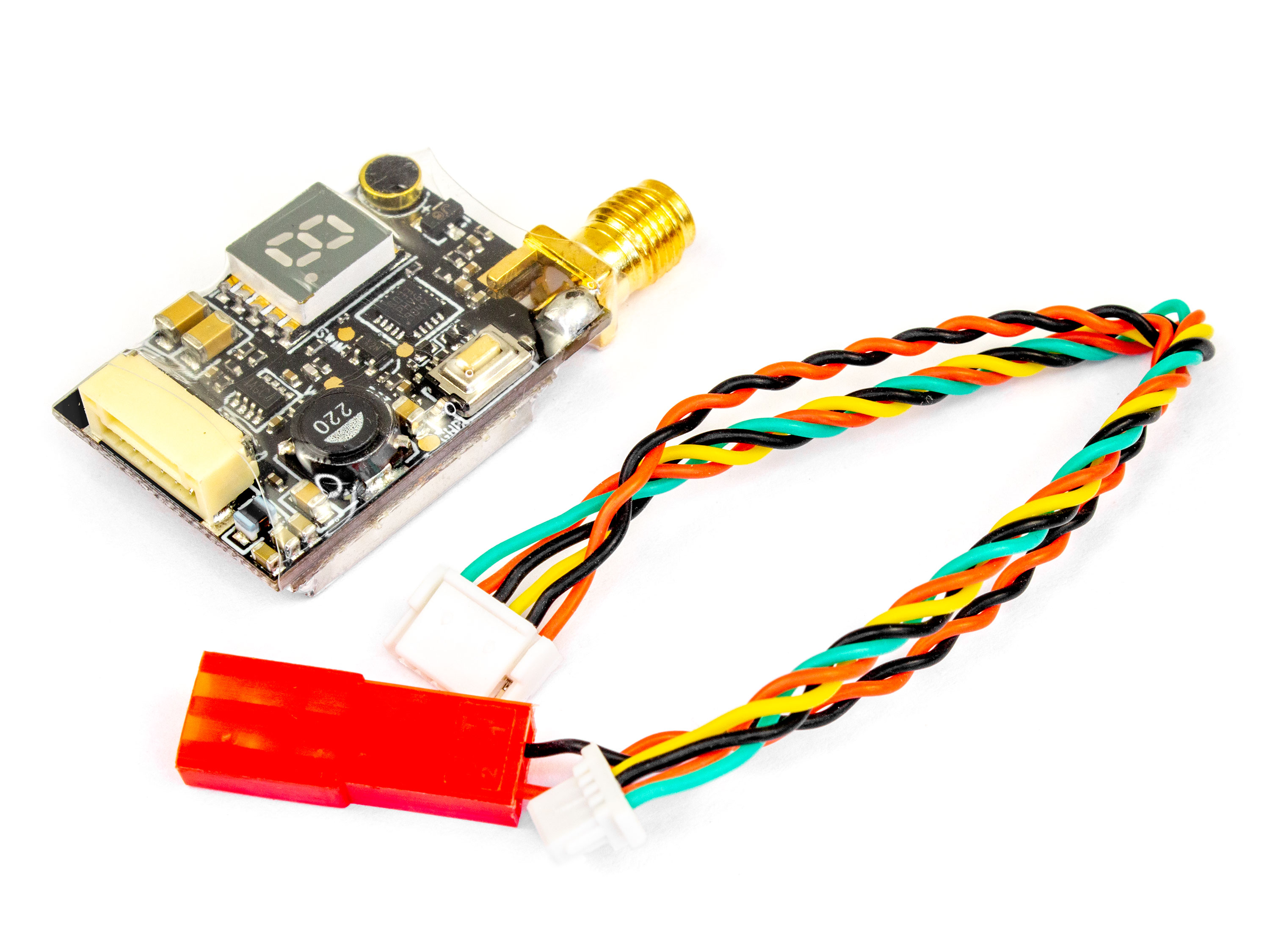 Потужний відеопередавач AKK X2 з підтримкою зміни налаштувань за допомогою Smart Audio та з вбудованим перетворювачем на 5В для камери. На платі є кнопка для ручного перемикання потужності, частоти або каналів. Відображаються обраний канал, потужність і частота на цифровому екрані. Технічні характеристики: - Робоча частота: 5.8ГГц;