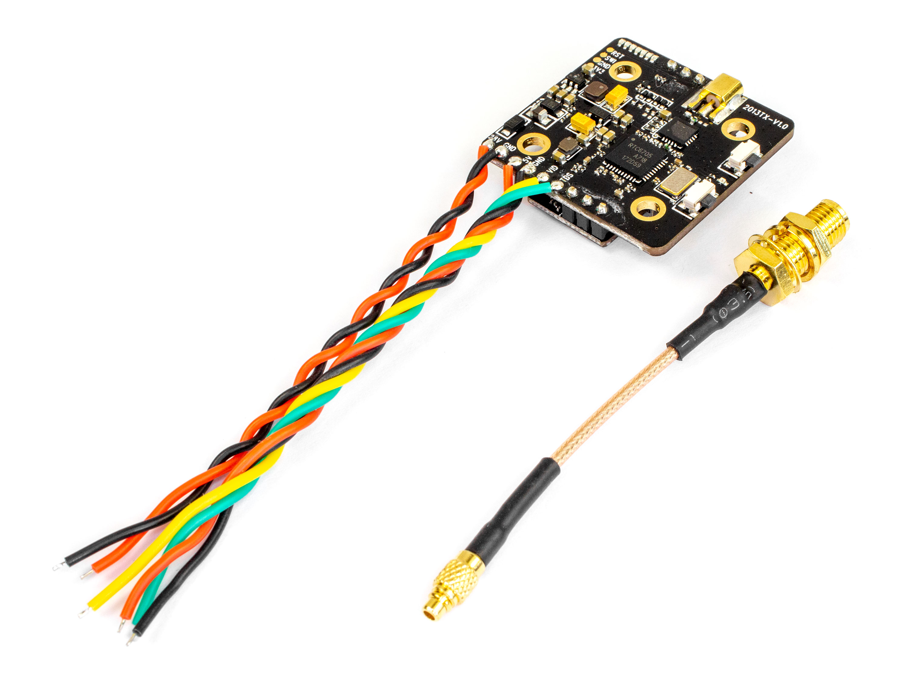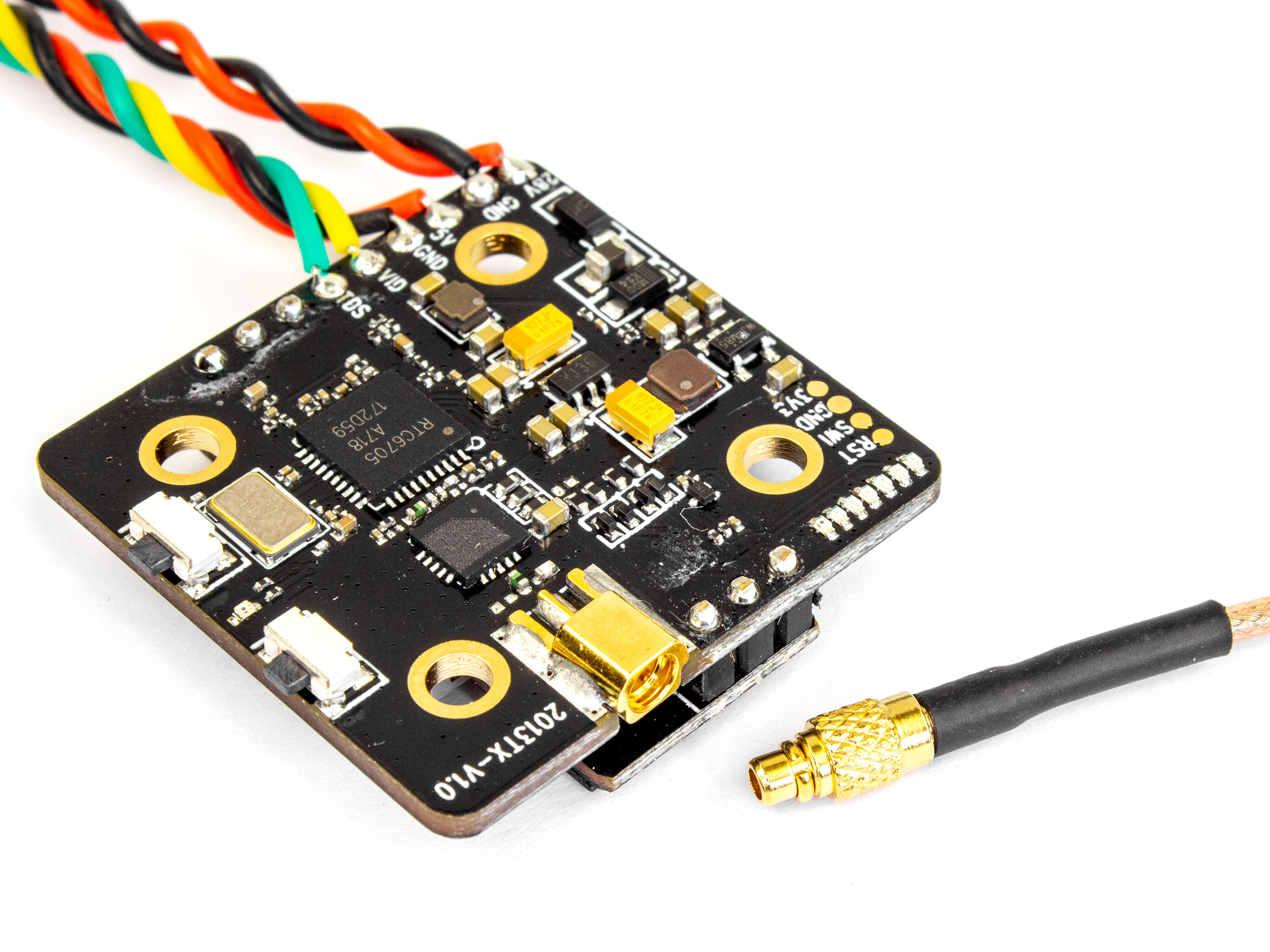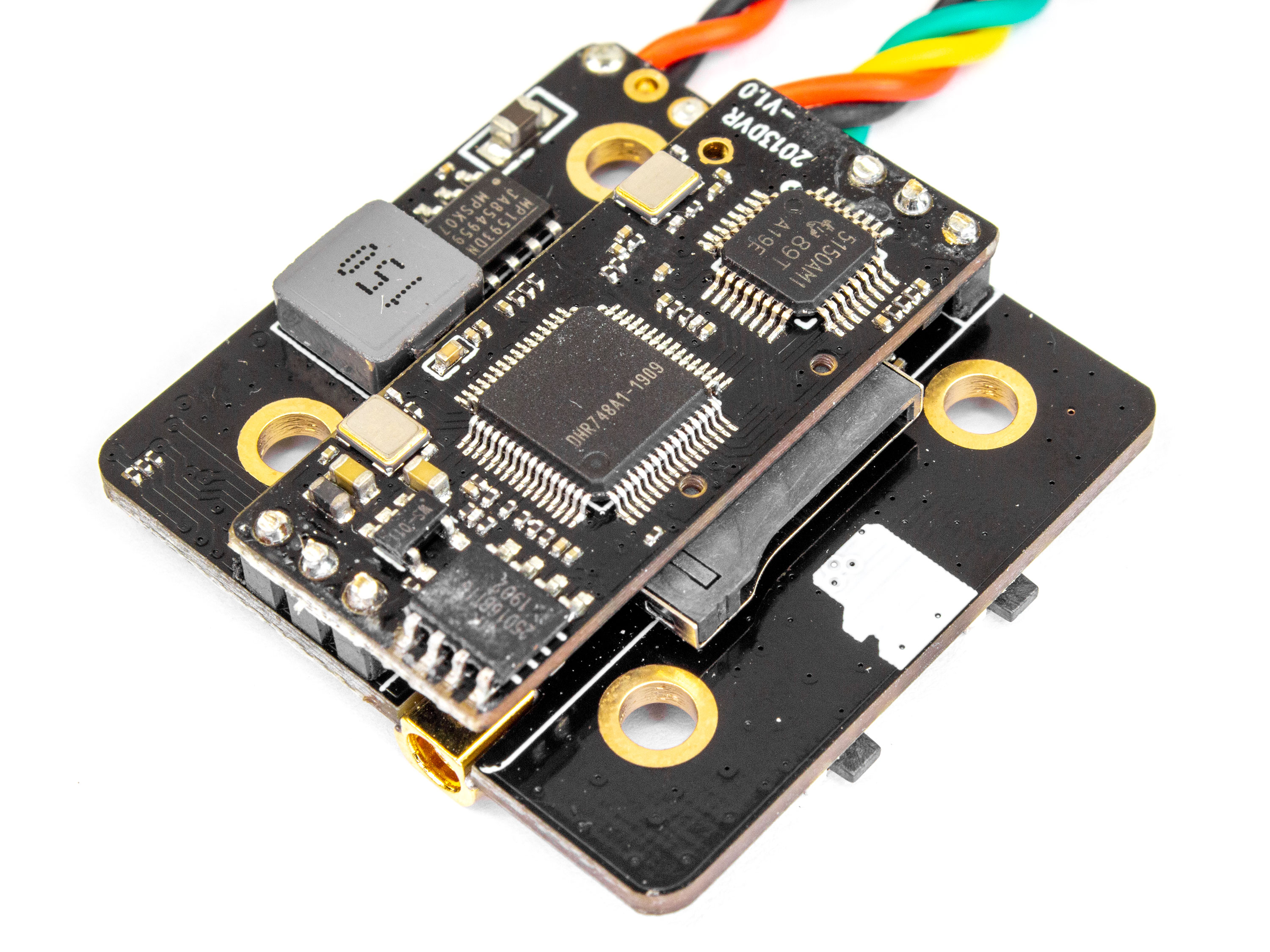 Потужний відеопередавач FX3-Ultimate з підтримкою зміни налаштувань за допомогою Smart Audio та вбудованим модулем DVR для запису відео. На платі є кнопка для ручного перемикання потужності, частоти або каналів та кнопка DVR для ввімкнення/вимкнення запису відео. Для відображення статусу роботи DVR а також обраного каналу, потужності та частоти, використовуються LED-індикатори. Для запису відео використовується MicroSD-карта (не входить в комплект). Технічні характеристики: - Робоча частота: 5.8ГГц;