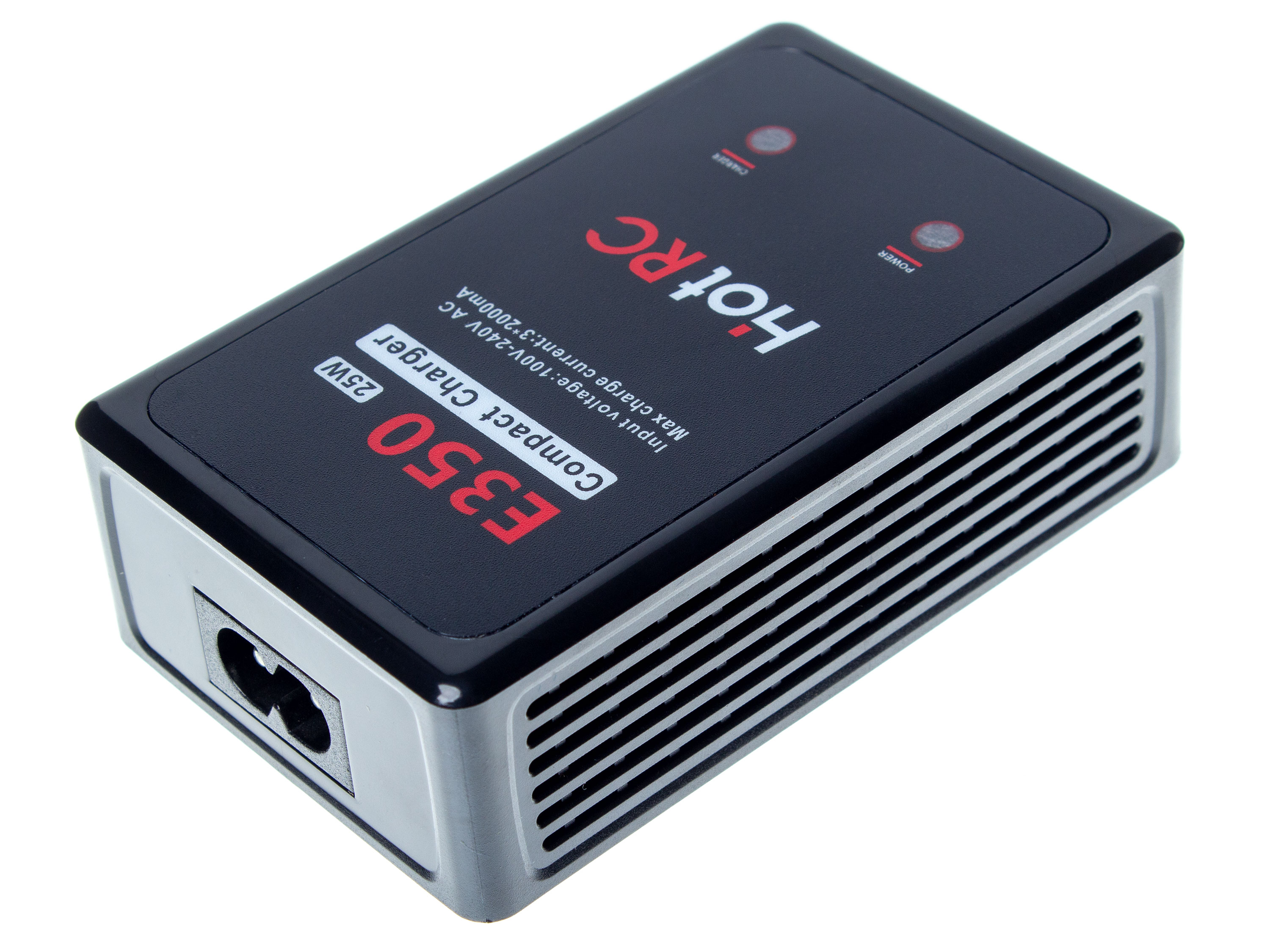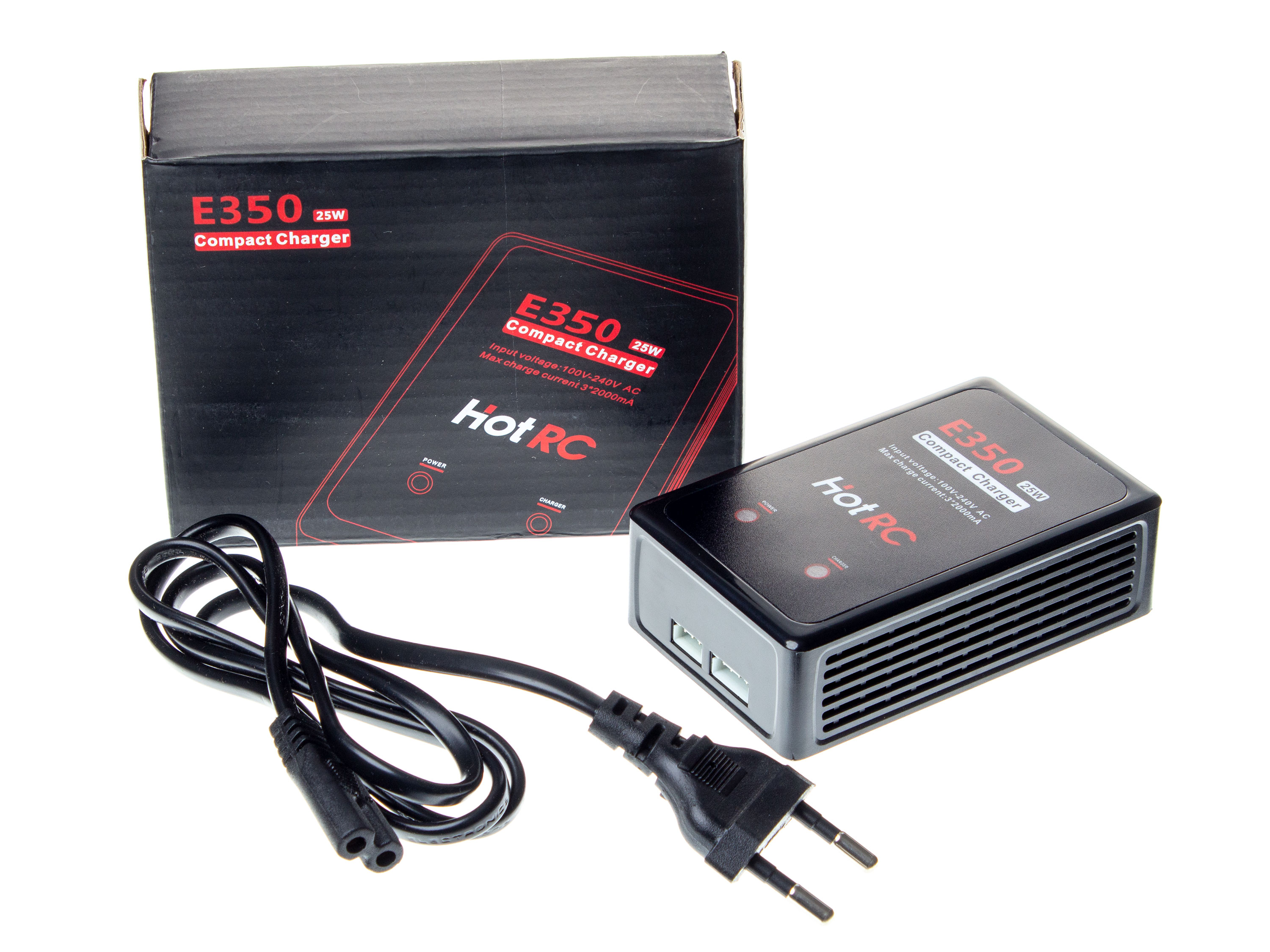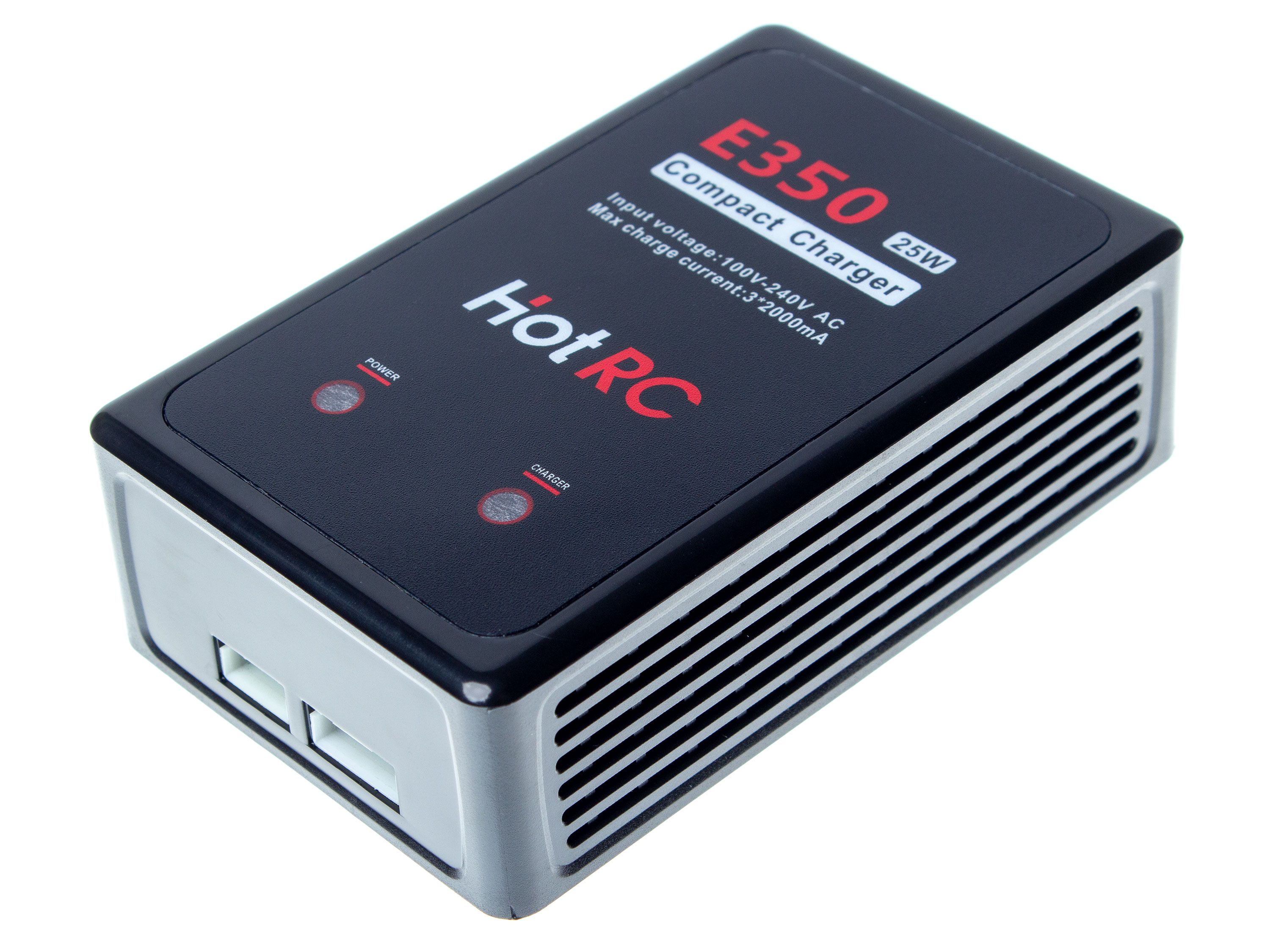 Балансувальний зарядний пристрій для 2S/3S LiPo акумуляторів, з вбудованим блоком живлення. LED-індикація статусу заряду акумулятора та індикація живлення зарядного. Зарядний пристрій HotRC E350 аналогічний зарядному B3, відрізняється лише потужністю та розміром. Навідміну від HotRC B3 з максимальним струмом заряду до 0.8А, HotRC E350 підтримує заряд 3S LiPo акумуляторів з максимальним струмом до 2А на кожен елемент. Технічні характеристики: