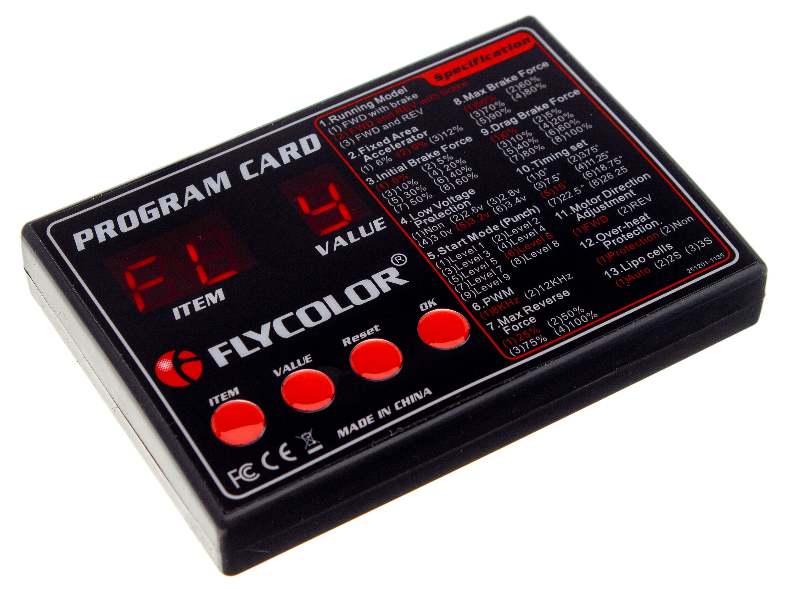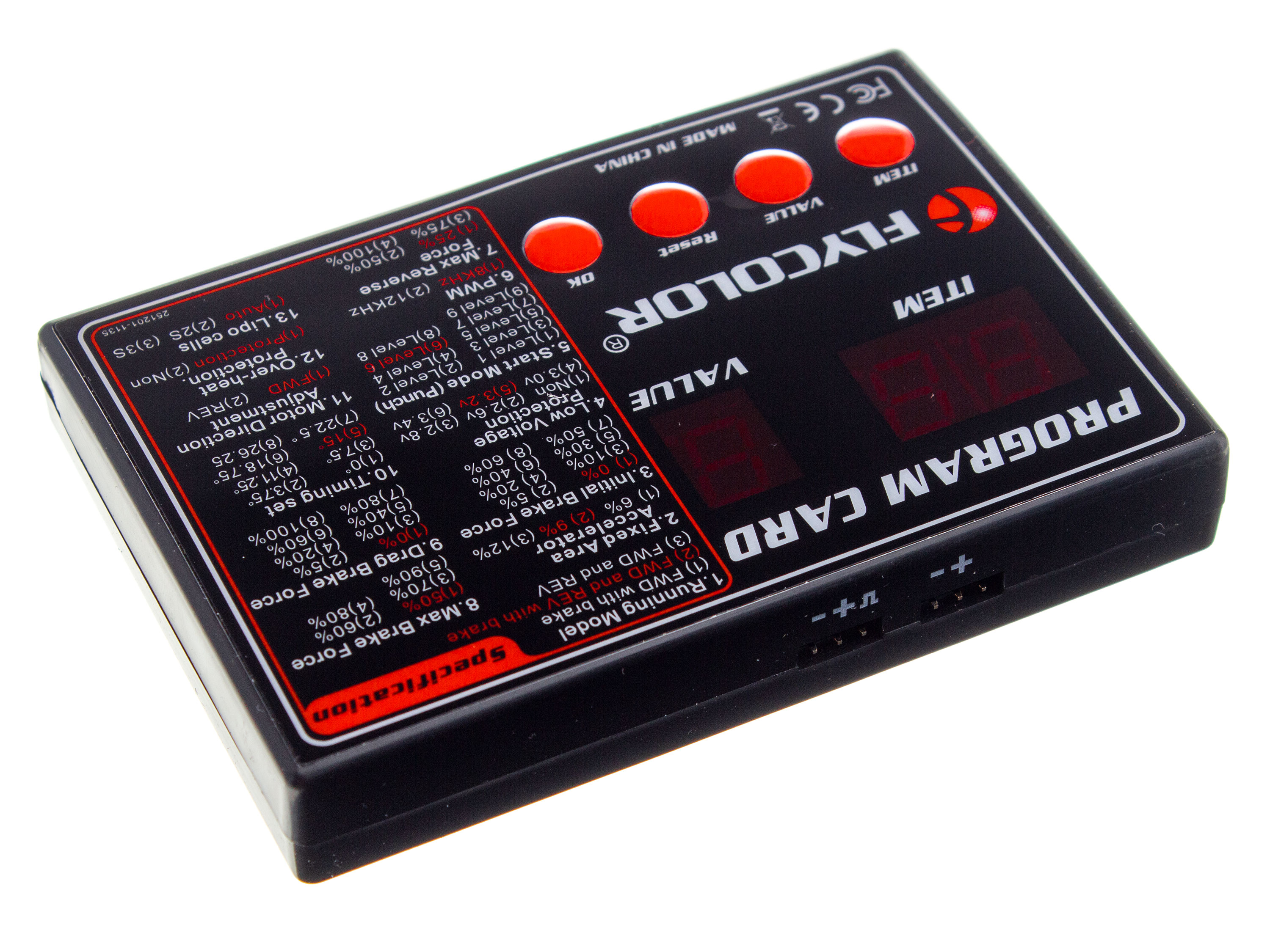 Карта програмування потрібна для налаштування параметрів роботи безколекторних регуляторів швидкості FlyColor для автомоделей. У разі, коли регулятор не має вбудованого BECа, слід застосовувати додаткову АКБ для подачі живлення на програматор. Програмовані функції: - 1. Running Mode (режими руху):