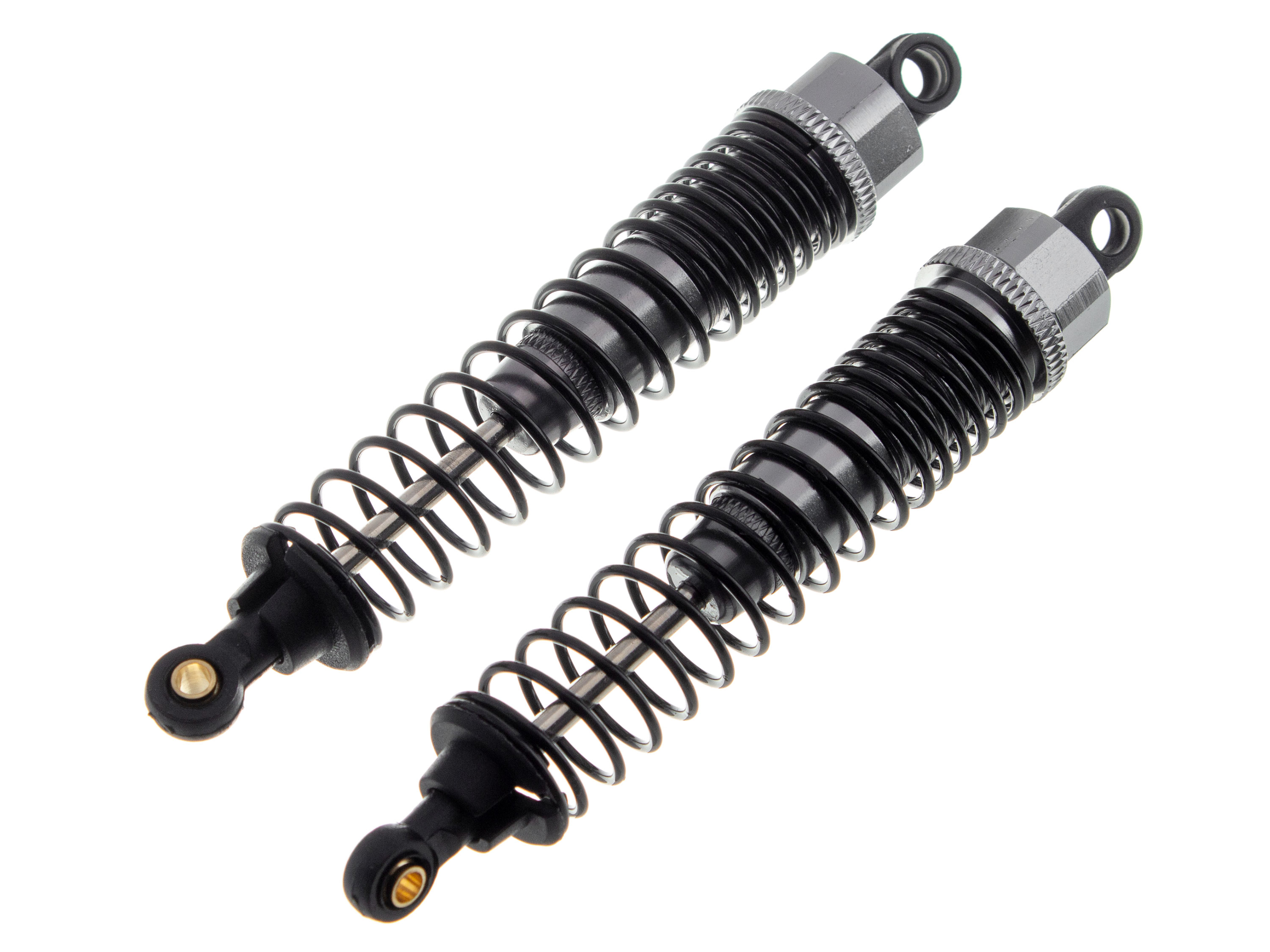 Алюмінієві амортизатори для автомоделей 1/10 масштабу. Отвори кріплення розраховані під кульовий шарнір діаметром 5.8мм. Для користування, амортизатори потрібно наповнити оливою. Технічні характеристики: - Загальна довжина амортизатора: 107мм;