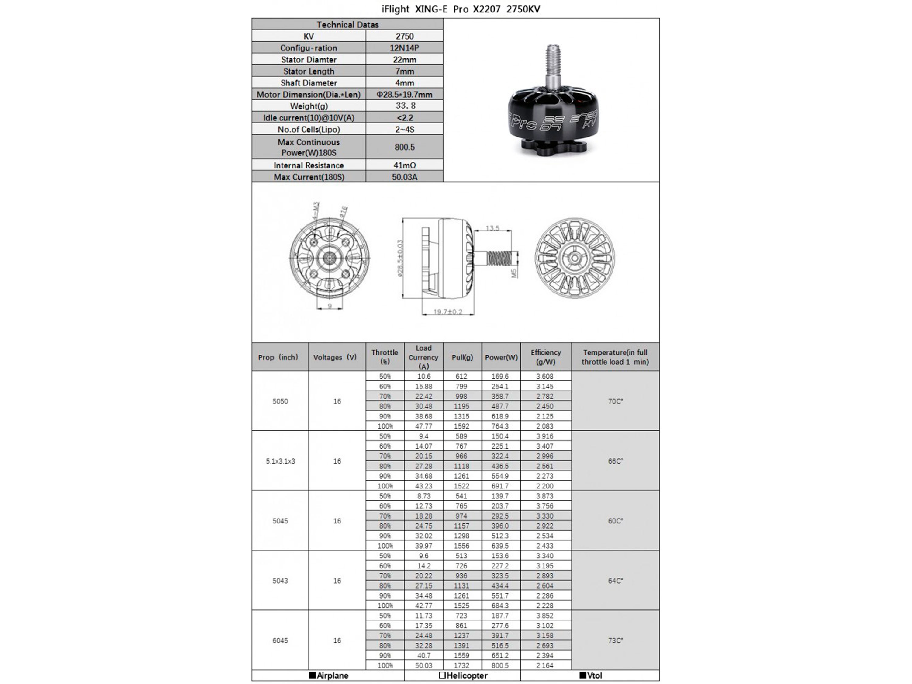 - Рекомендований пропелер: 5043, 5045, 5050, 6040, 6045 (2 лопаті);