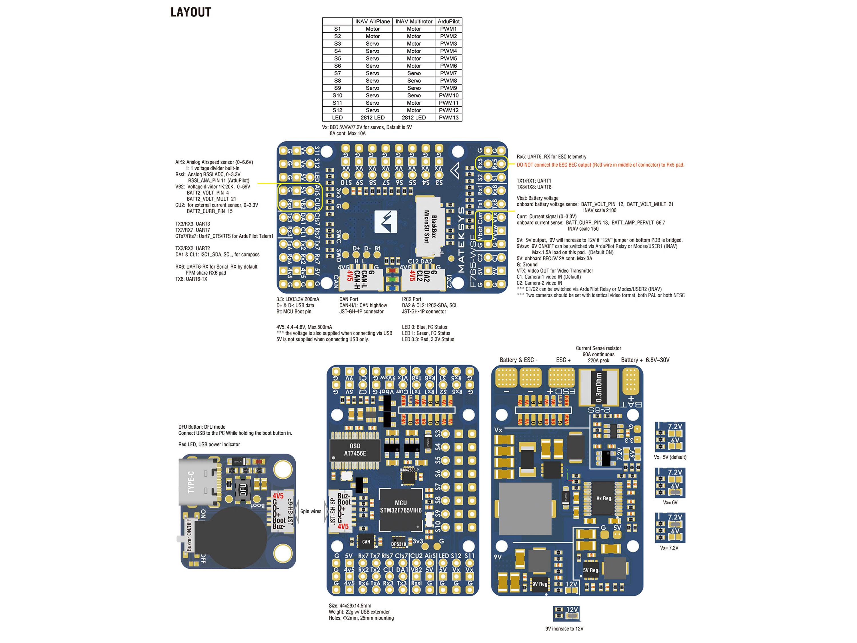 - 6x ADC (VBAT, Current, RSSI, AirSpeed, VB2, CU2);