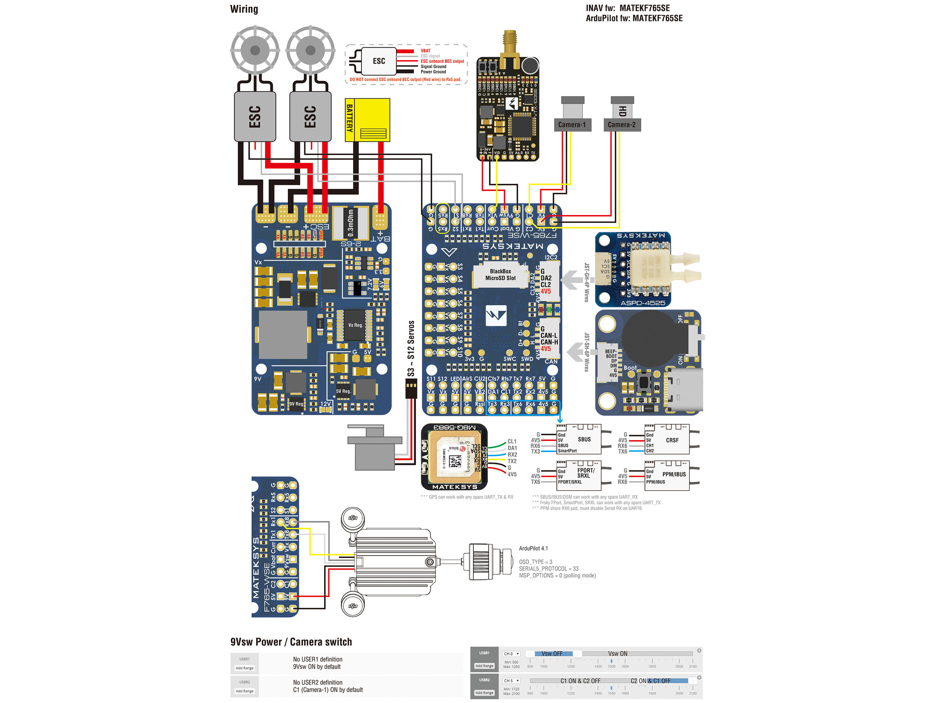 - Прошивка: iNAV / ArduPilot (ціль MATEKF765SE);