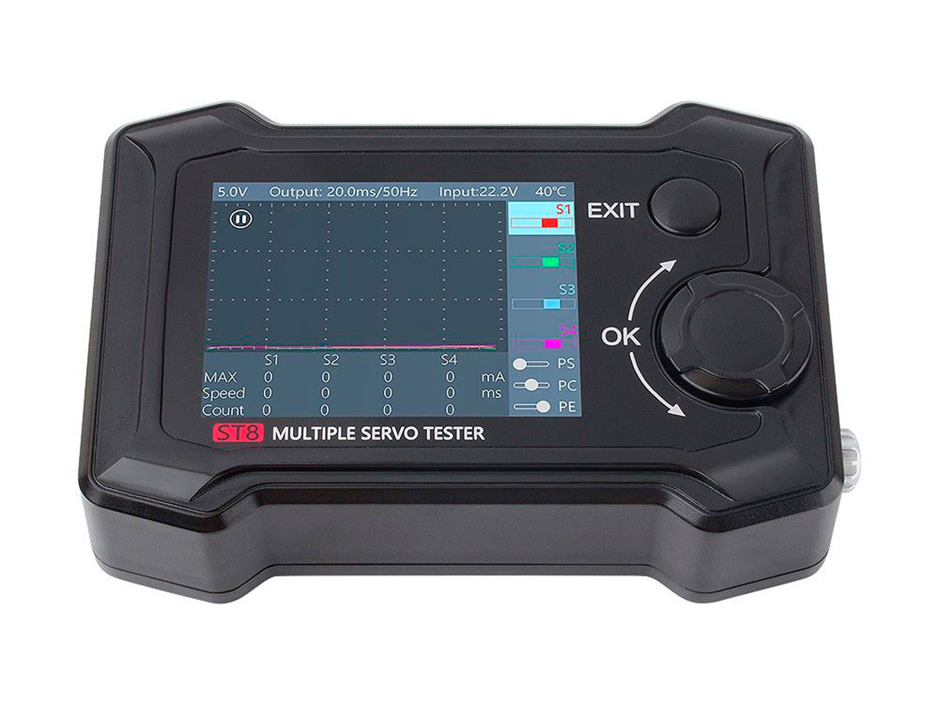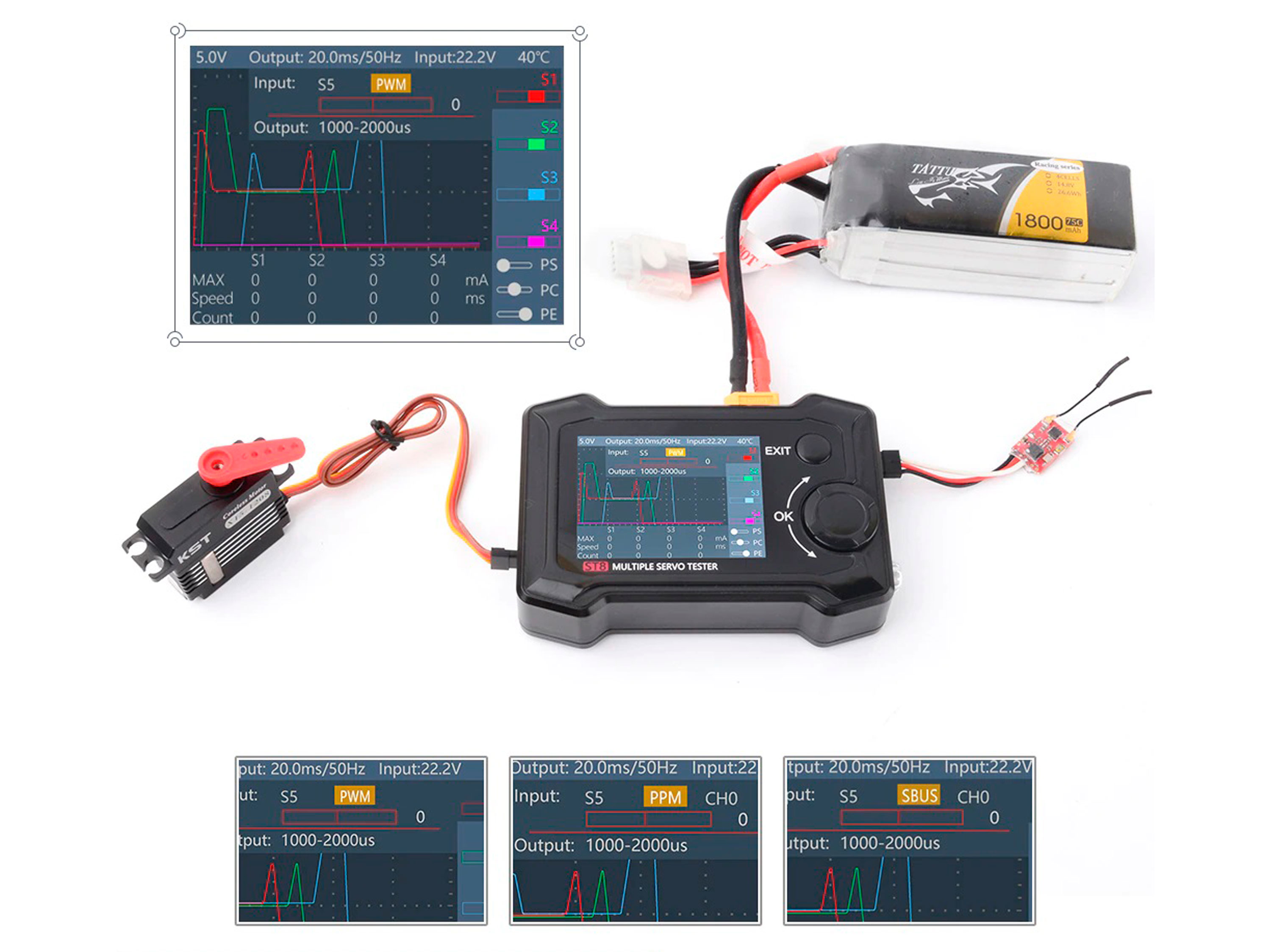 Сервотестер (PWM, PPM, SBUS). Можливість під'єднання сервомеханізмів або безколекторних двигунів (через регулятор), для перевірки працездатності або виставлення сервоприводу в нульове положення. Автоматичний або ручний режим на вибір.