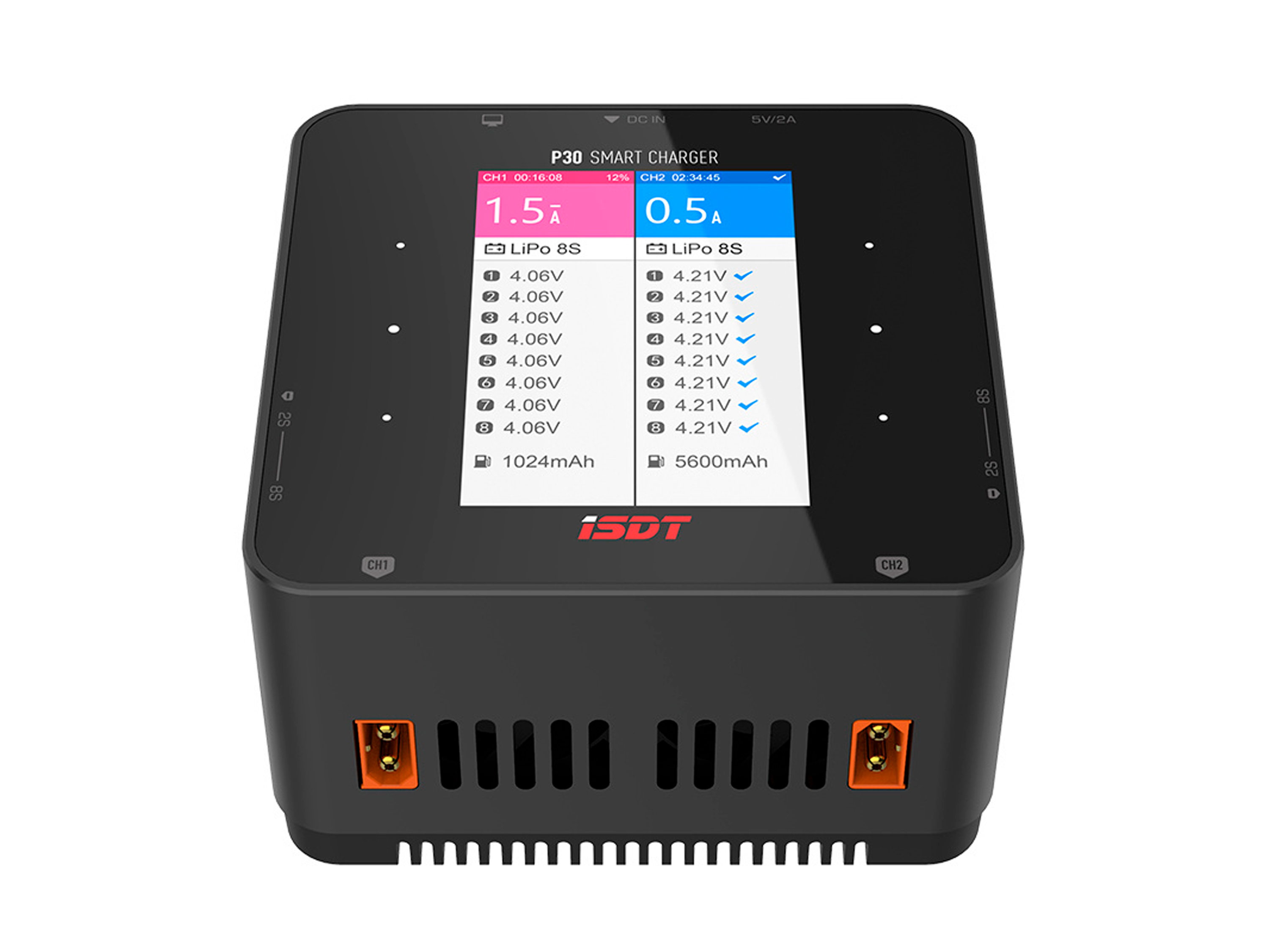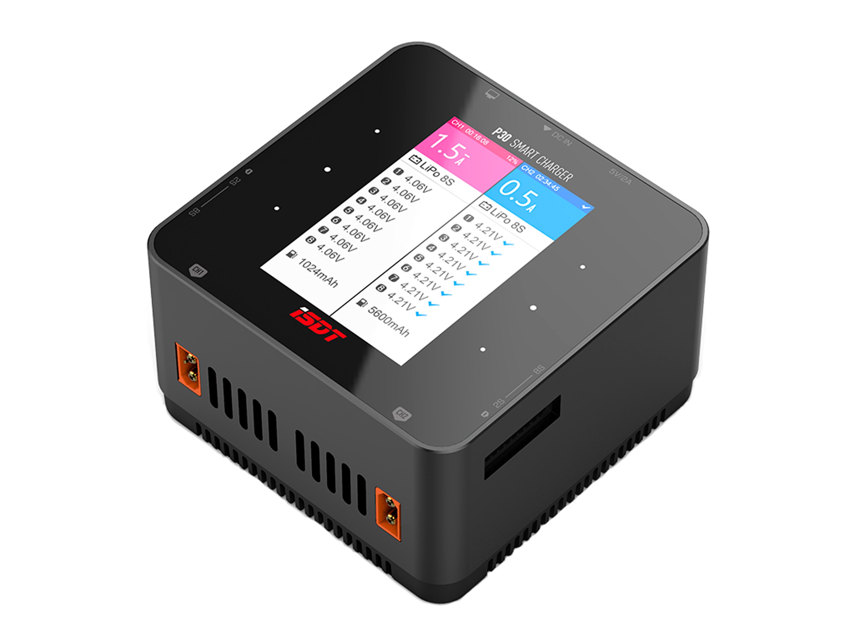 Універсальний, двохпортовий зарядний пристрій iSDT P30 з максимальною потужністю у 1000Вт на кожен порт. Кожен канал зарядного може працювати незалежно один від одного, що дозволяє одночасно заряджати два акумулятори різної ємності або хімії. Також є можливість об'єднати обидва канали паралельно для синхронного, балансувального заряду акумулятора зі струмом 50А та максимальною потужністю до 1500Вт. Особливості: - Максимальна потужність до 1500Вт;