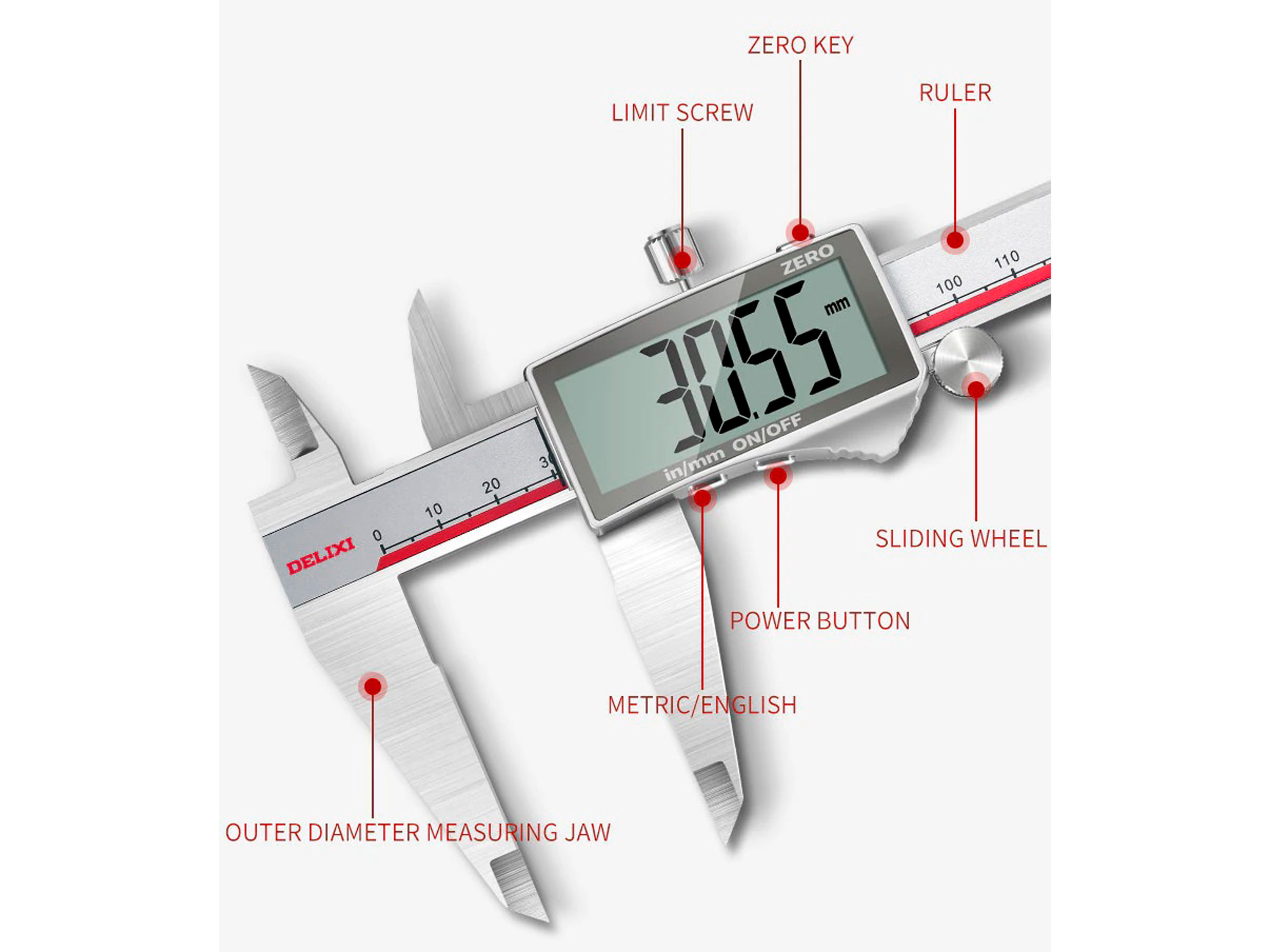Цифровий штангенциркуль Delixi призначений для вимірювання зовнішніх та внутрішніх розмірів, а також глибини отворів. Технічні характеристики: - Точність вимірювання: 0.01мм / 0.001дюймів;