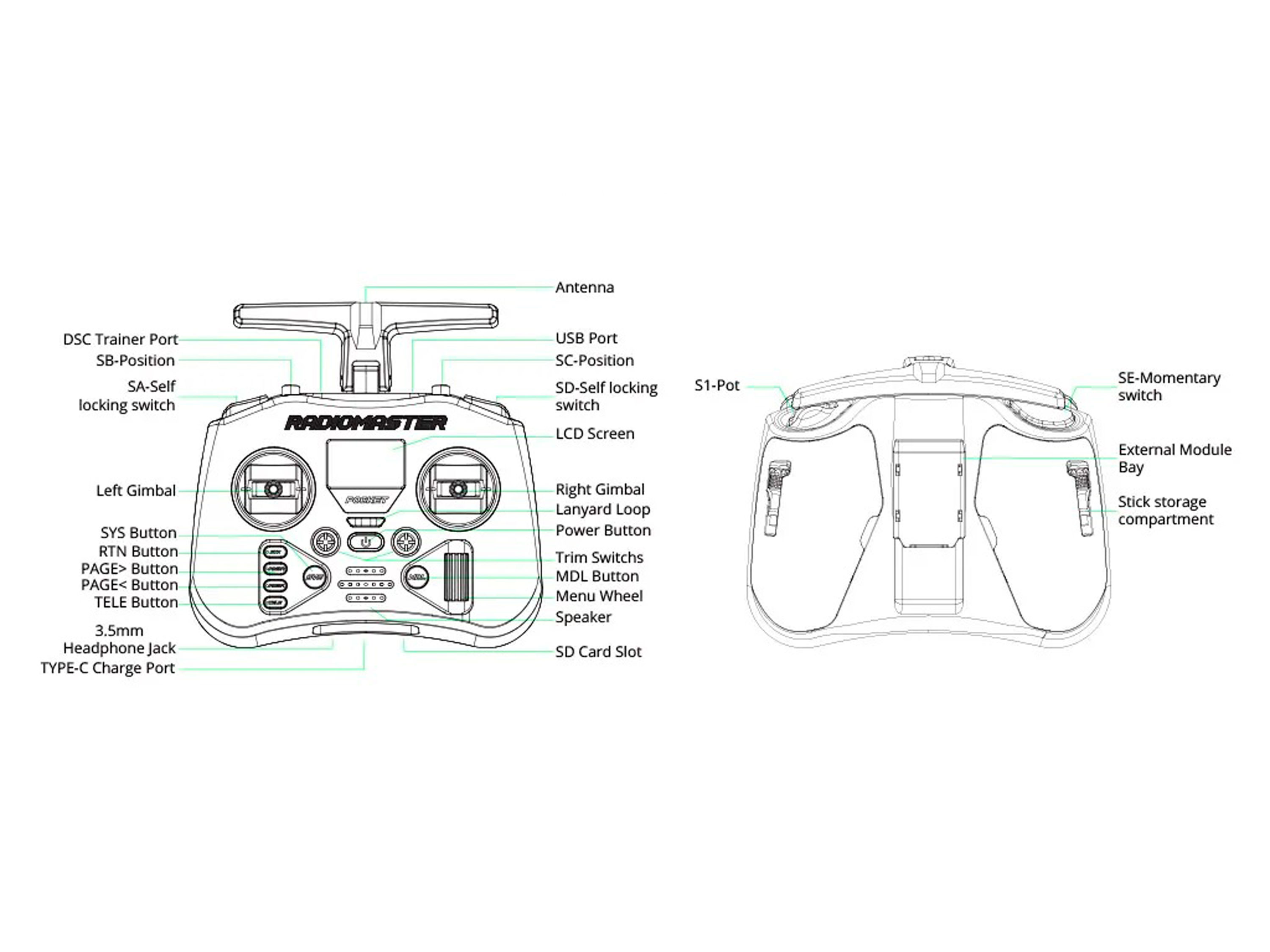 Передавач оснащено великим яскравим РК-екраном, регульованими стіками з датчиками Холла, відсіком для зовнішнього модуля нано-розміру, а також USB-C інтерфейсом для оновлення прошивки та заряду Li-ion акумуляторів.