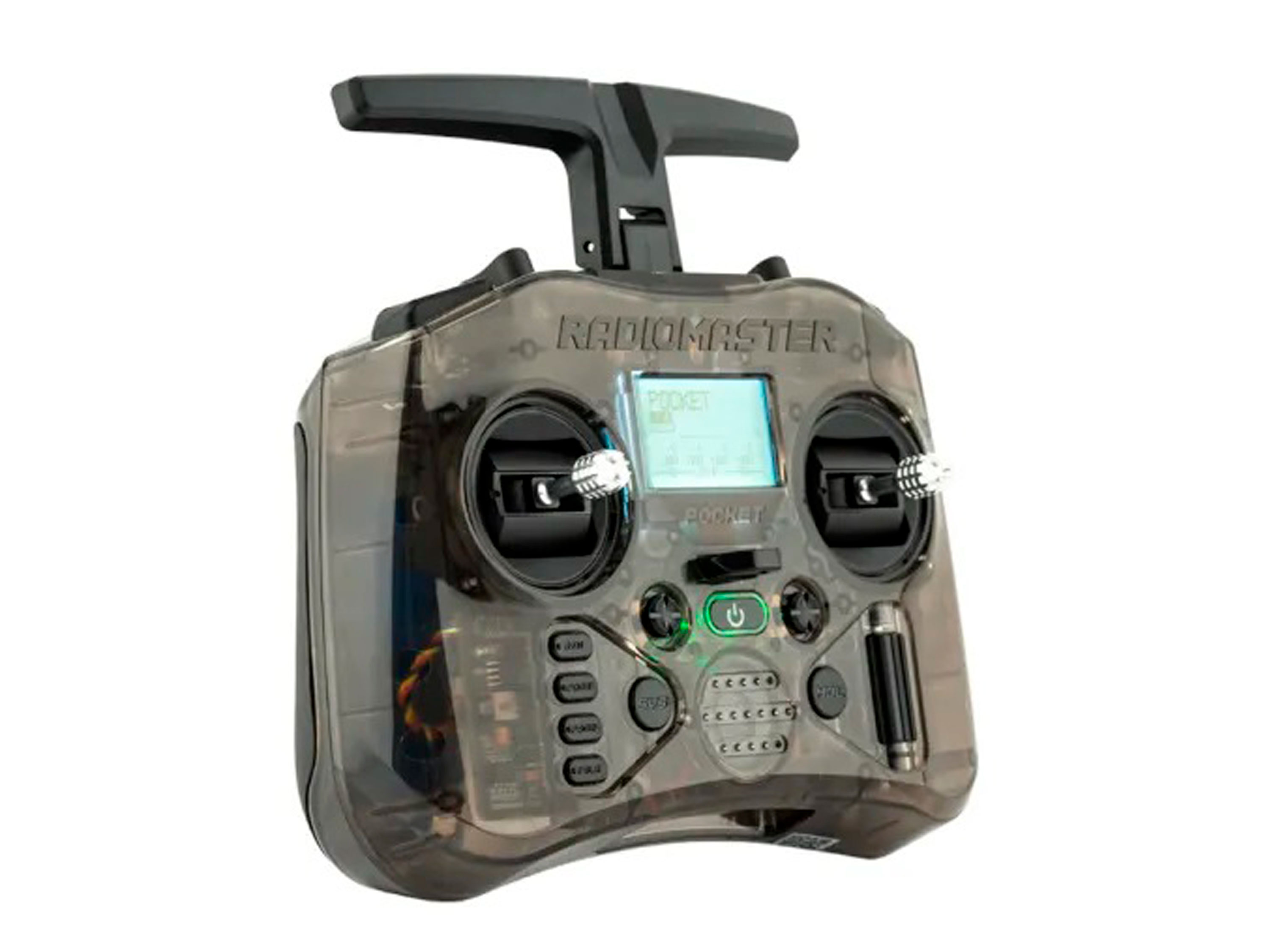 Pocket - це найменша і найлегша радіоапаратура від Radiomaster. Передавач оснащено великим яскравим РК-екраном, регульованими стіками з датчиками Холла, відсіком для зовнішнього модуля нано-розміру, а також USB-C інтерфейсом для оновлення прошивки та заряду Li-ion акумуляторів. RadioMaster Pocket також оснащений знімними стіками і складною антеною, що полегшує транспортування та зберігання. Для живлення передавача використовується два елементи Li-ion 18650. Особливості: - Компактний розмір і ергономічний дизайн;